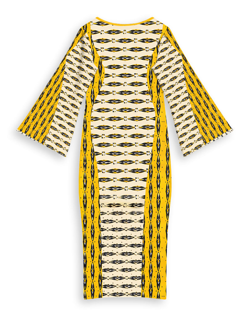 Abstract Tribal Art Round Neck Bell Sleeve Bodycon Long Dress