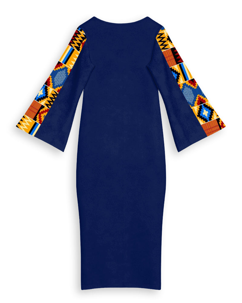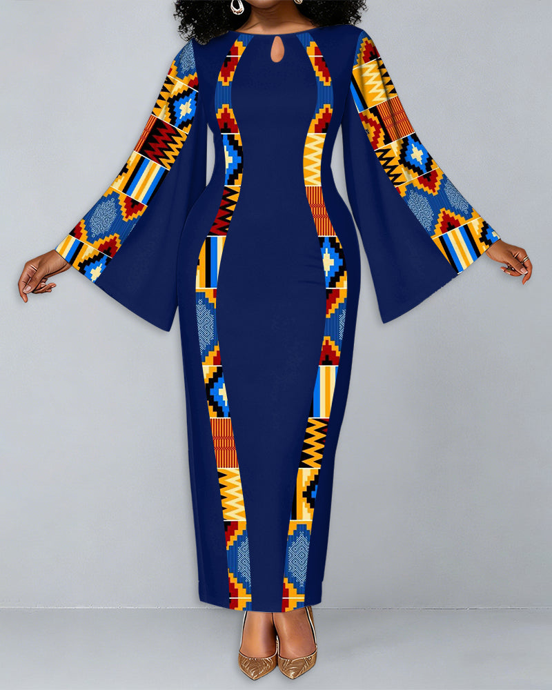 Ankara African American Culture Print Patchwork Round Neck Bell Sleeve Bodycon Long Dress