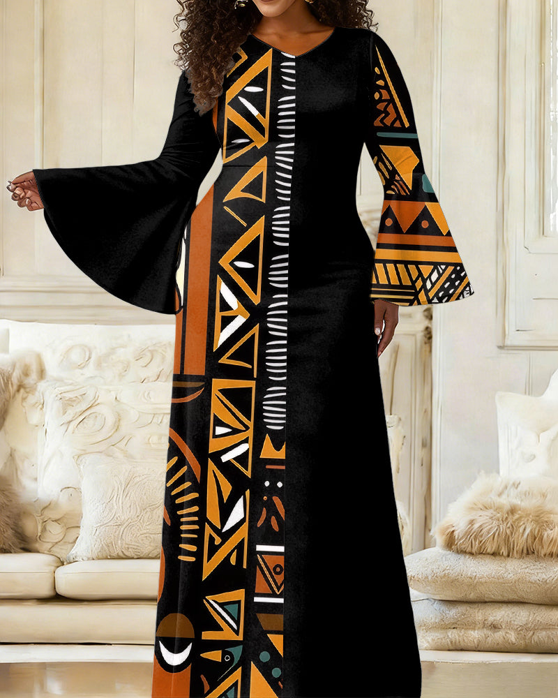 Ankara African American Culture Print Patchwork Round Neck Bell Sleeve Bodycon Long Dress