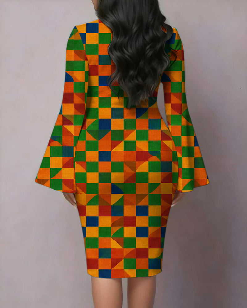 Ankara African American Culture Print Patchwork Round Neck Bell Sleeve Bodycon Long Dress