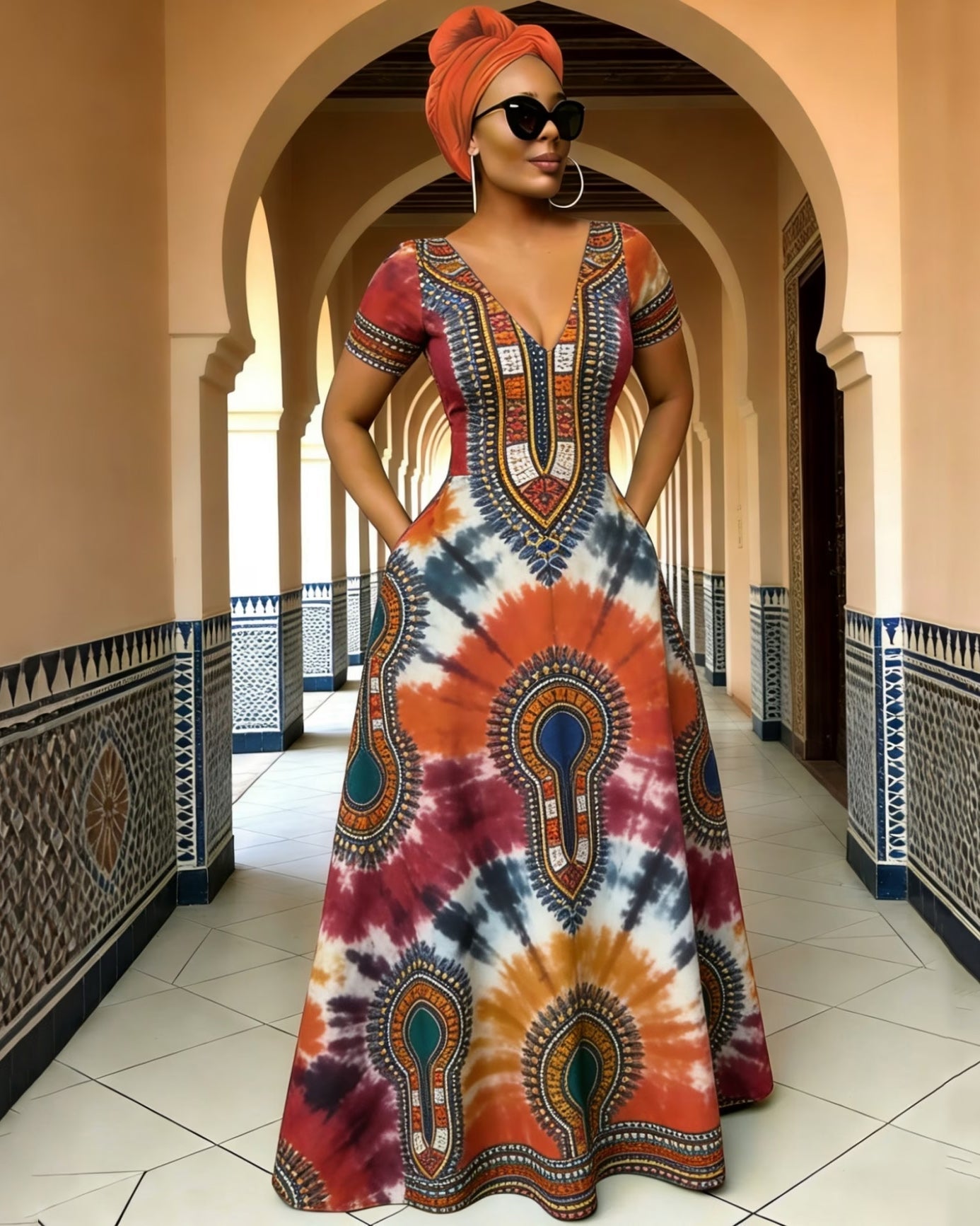 V Neck African Totem Tie-dye Print Short Sleeves Pocket Maxi Dress