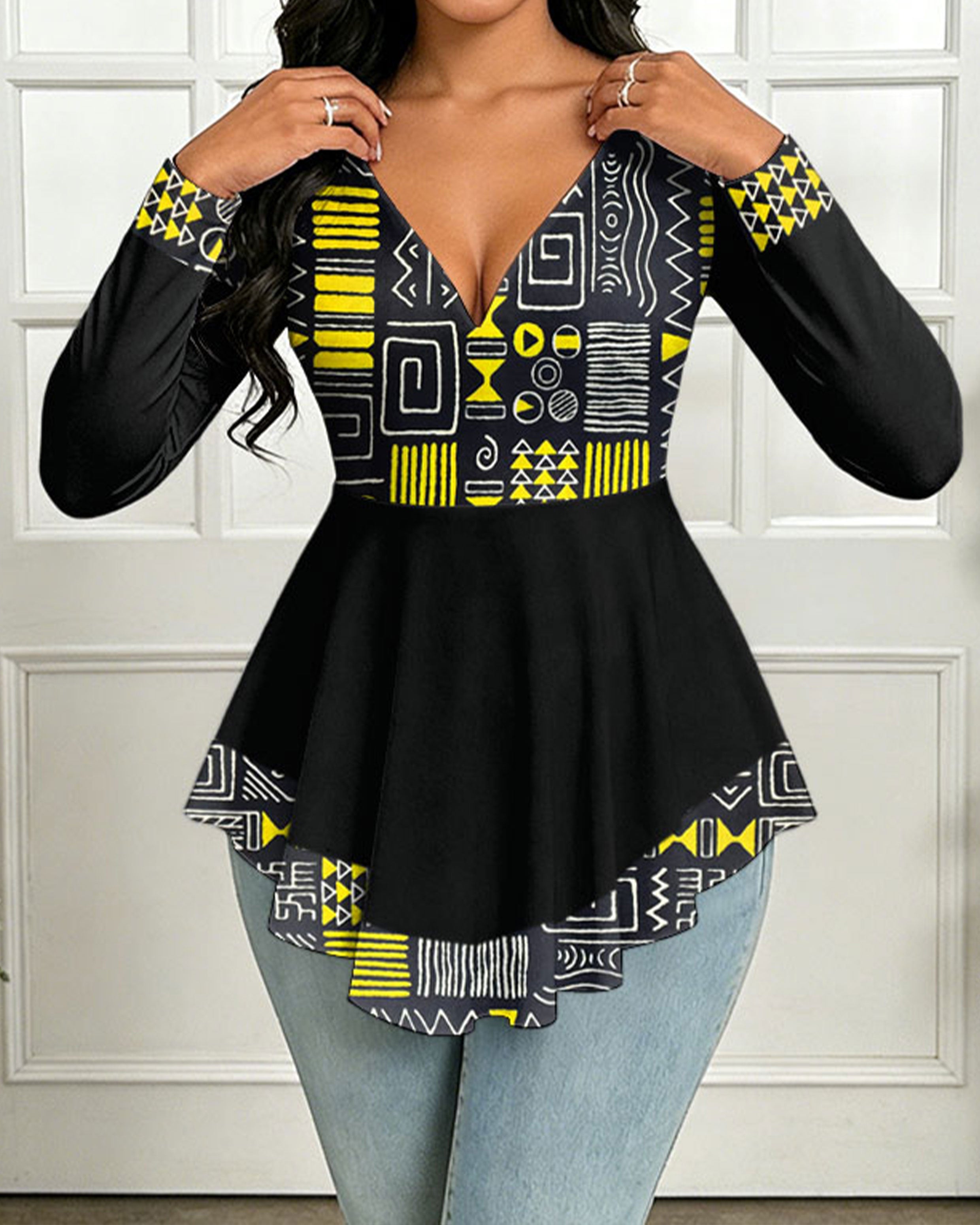 V-Neck Women's African Classic Geometric Black Elastic Round Neck Ruffled Top