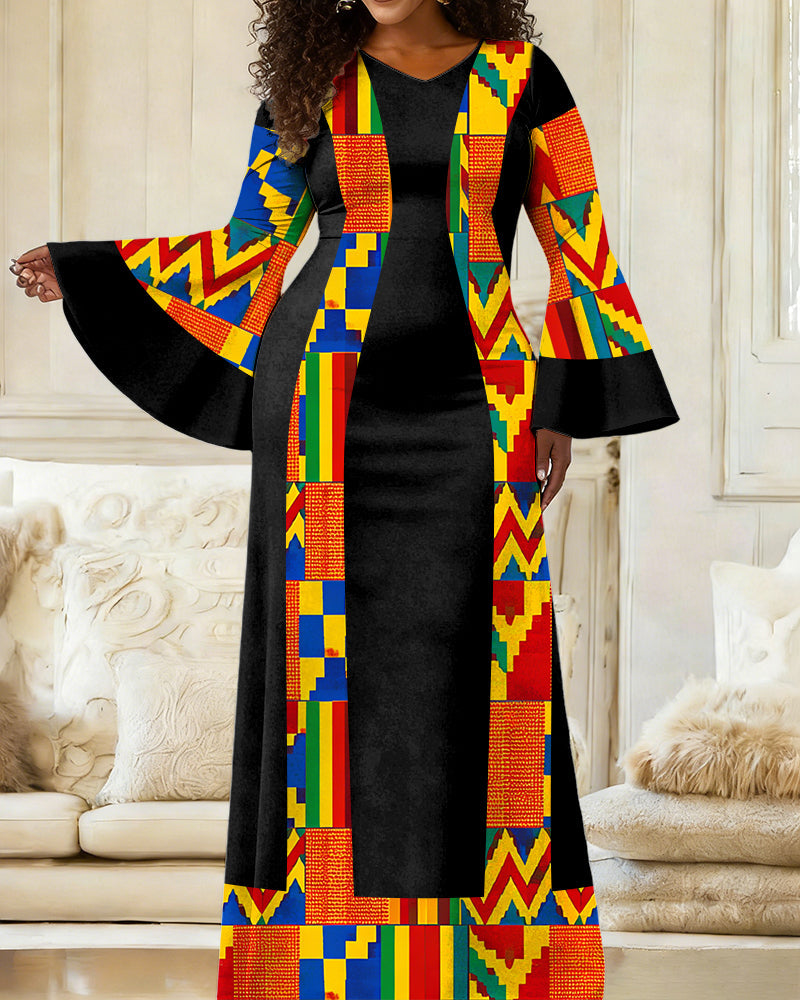 Women's Kente Cloth Design Print Elegant Bell-Sleeve Slim-Fit Dress