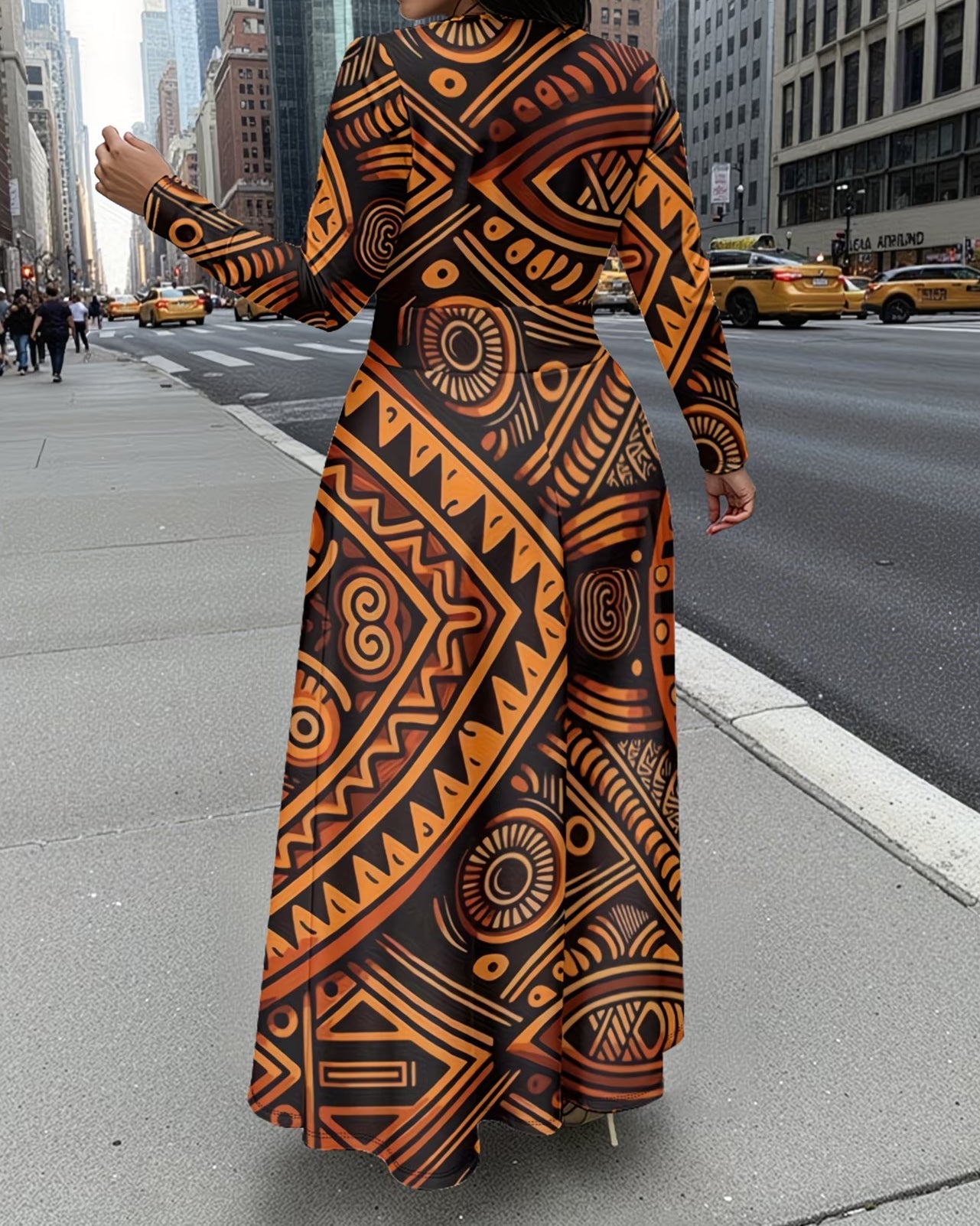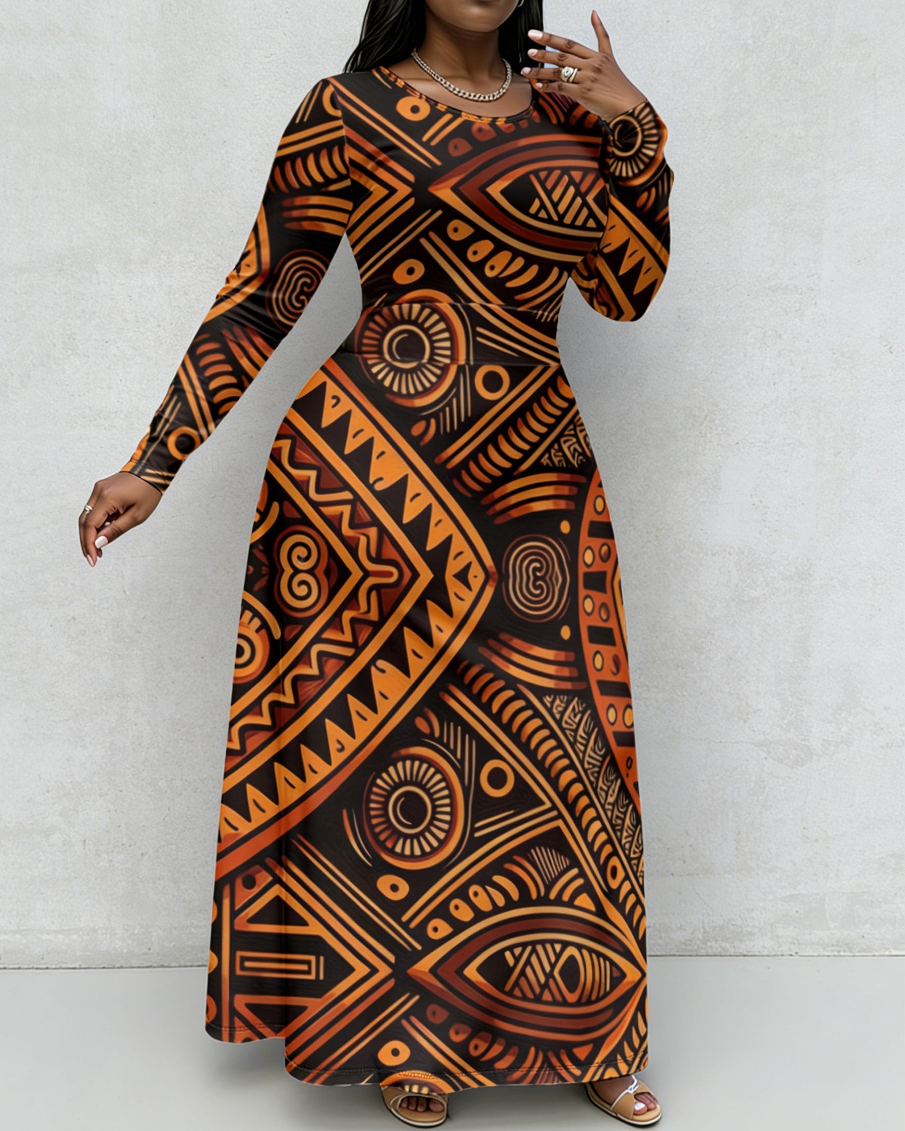 African Geometric Patterns Print Crewneck Long Sleeve Pocket Dress