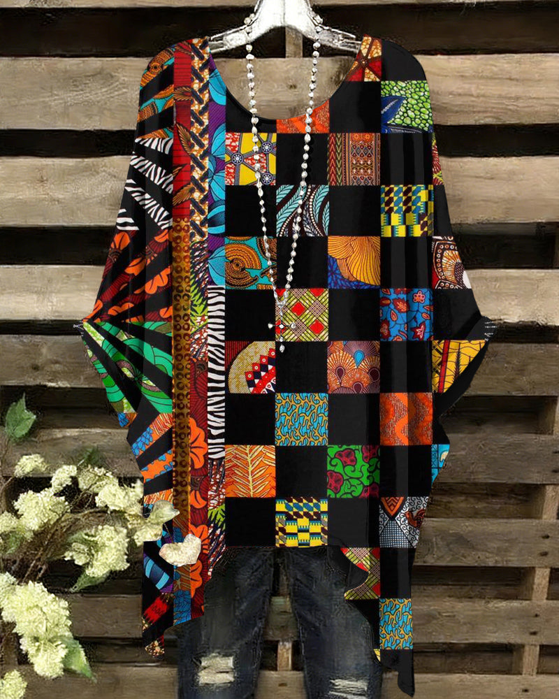African Pattern Collage Print Round Neck Irregular Shirt