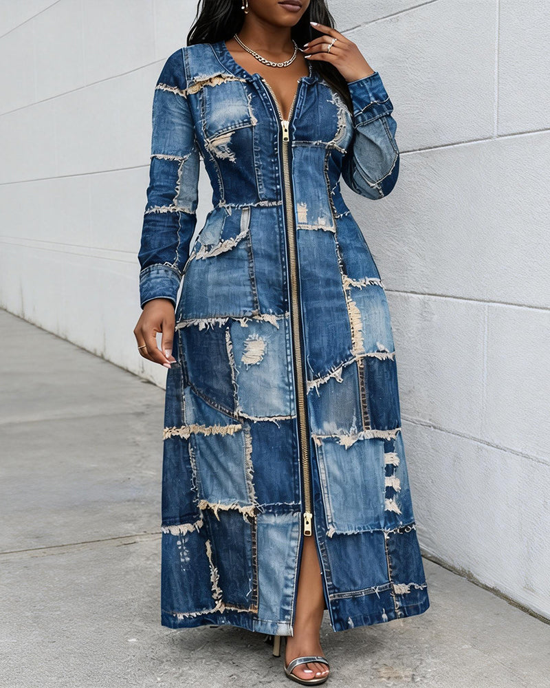 Patch Crewneck Zipper Long Sleeves Casual Dress