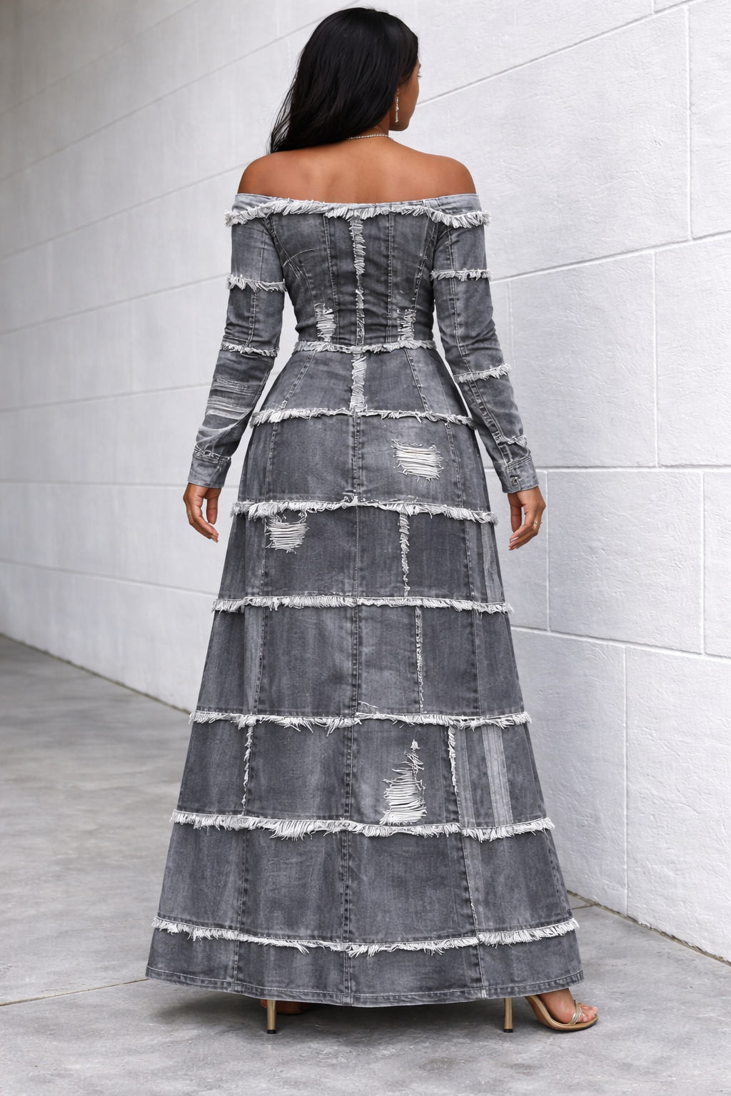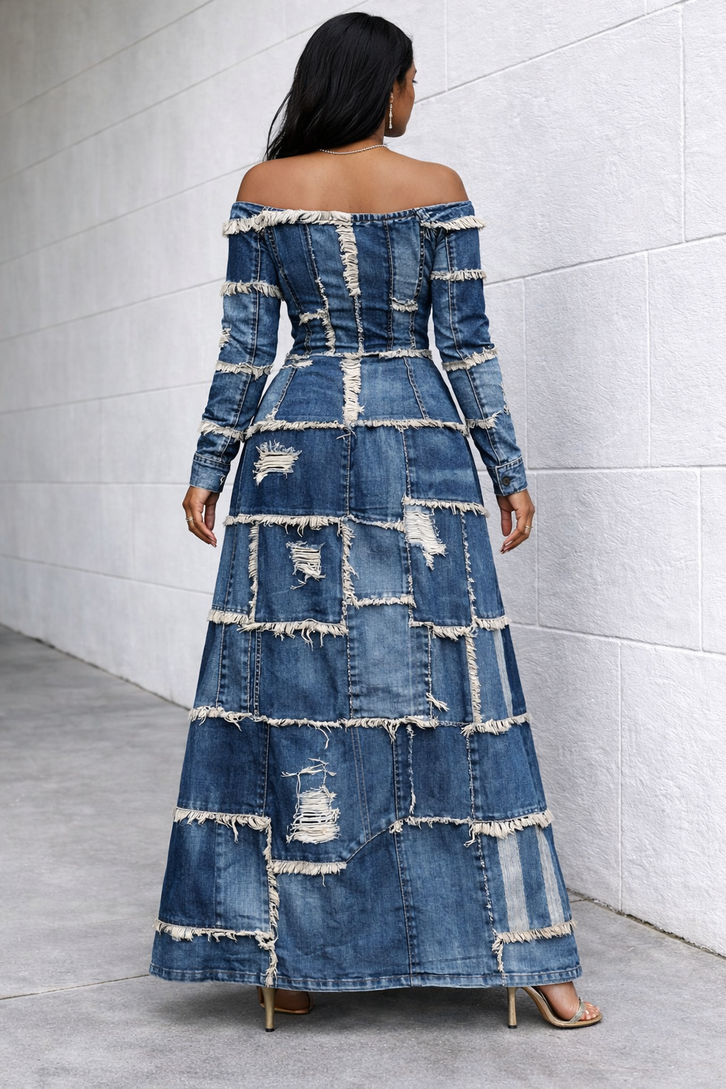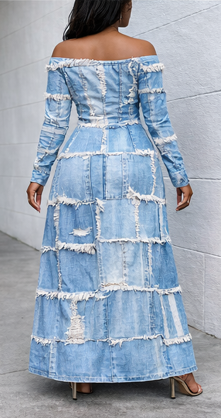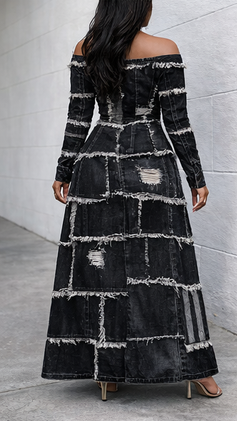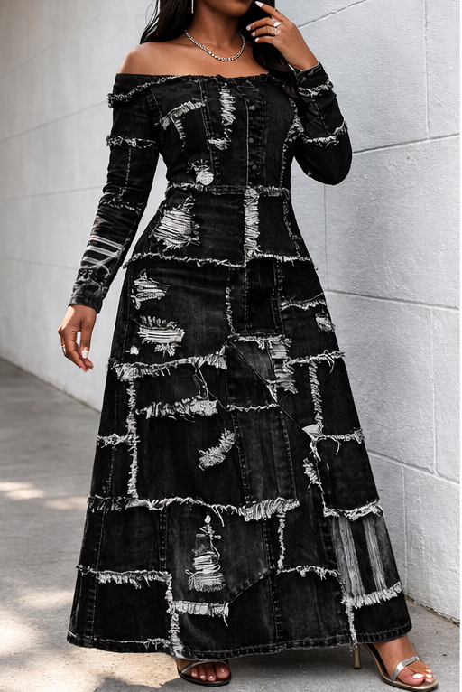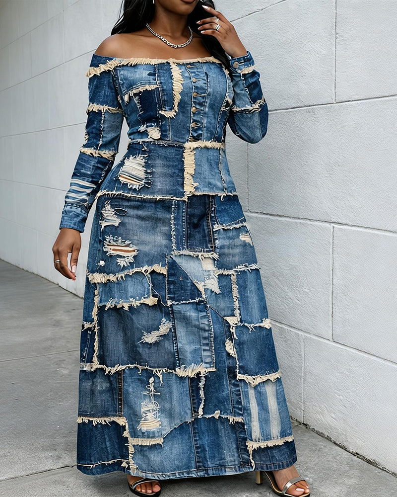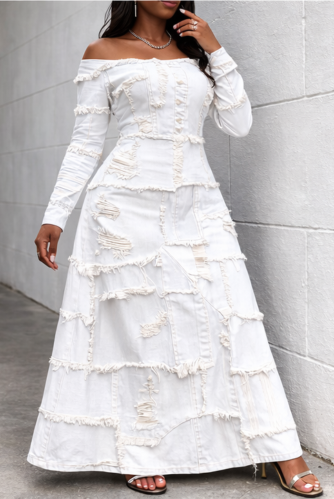 Patch Off-shoulder Long Sleeves Casual Maxi Dress