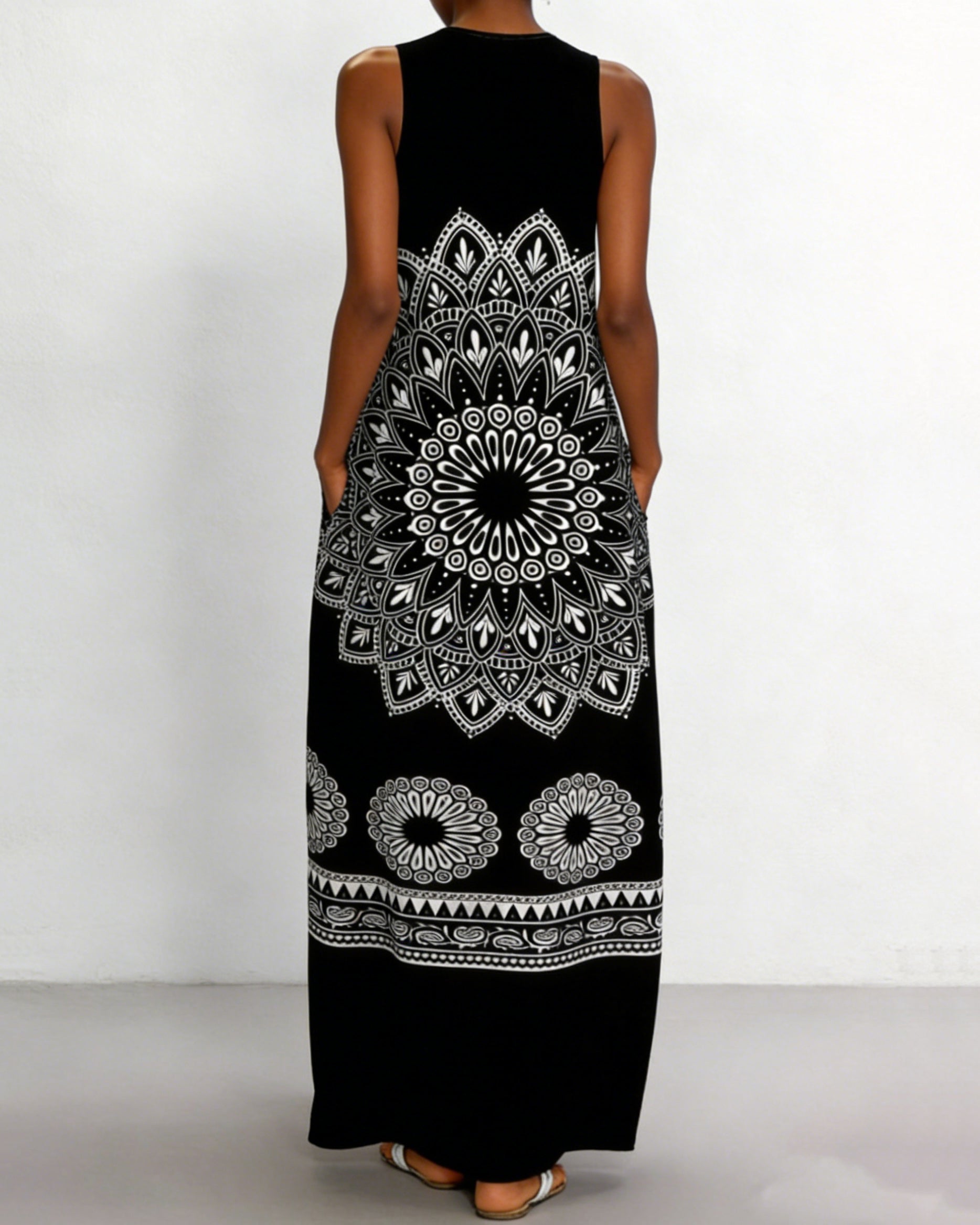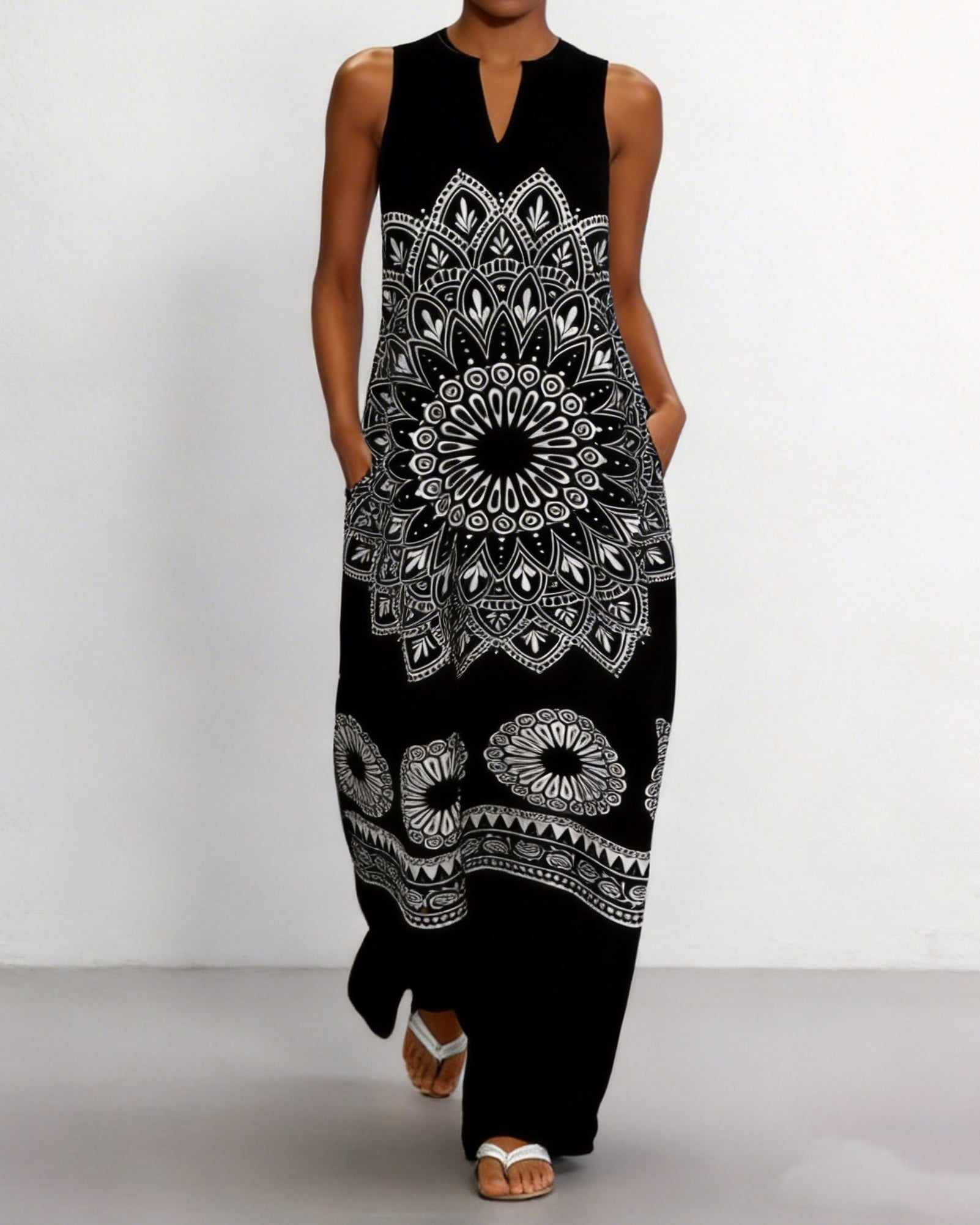 V-Neck Bohemian Geometric Patterns Print Pocket Long Dress
