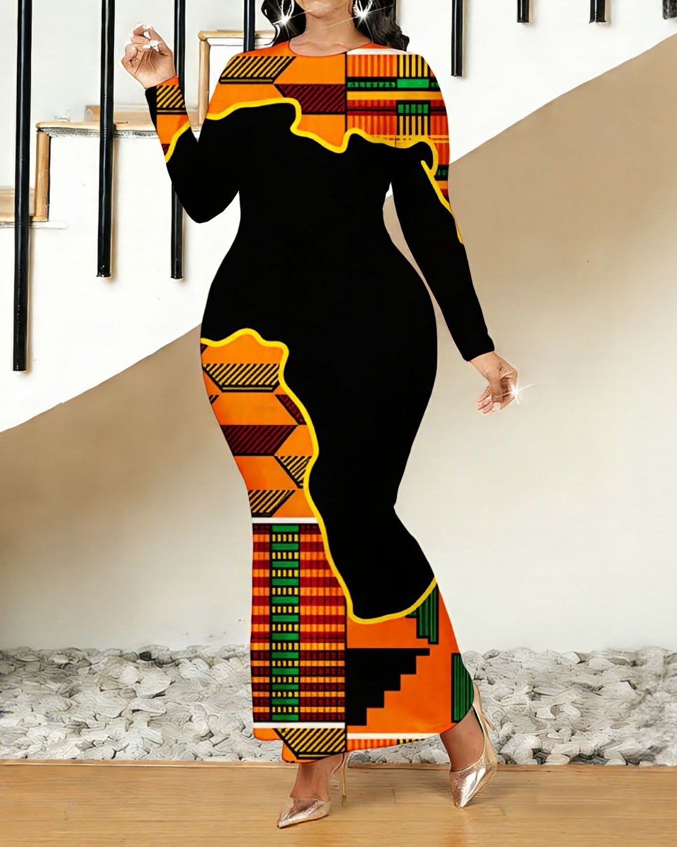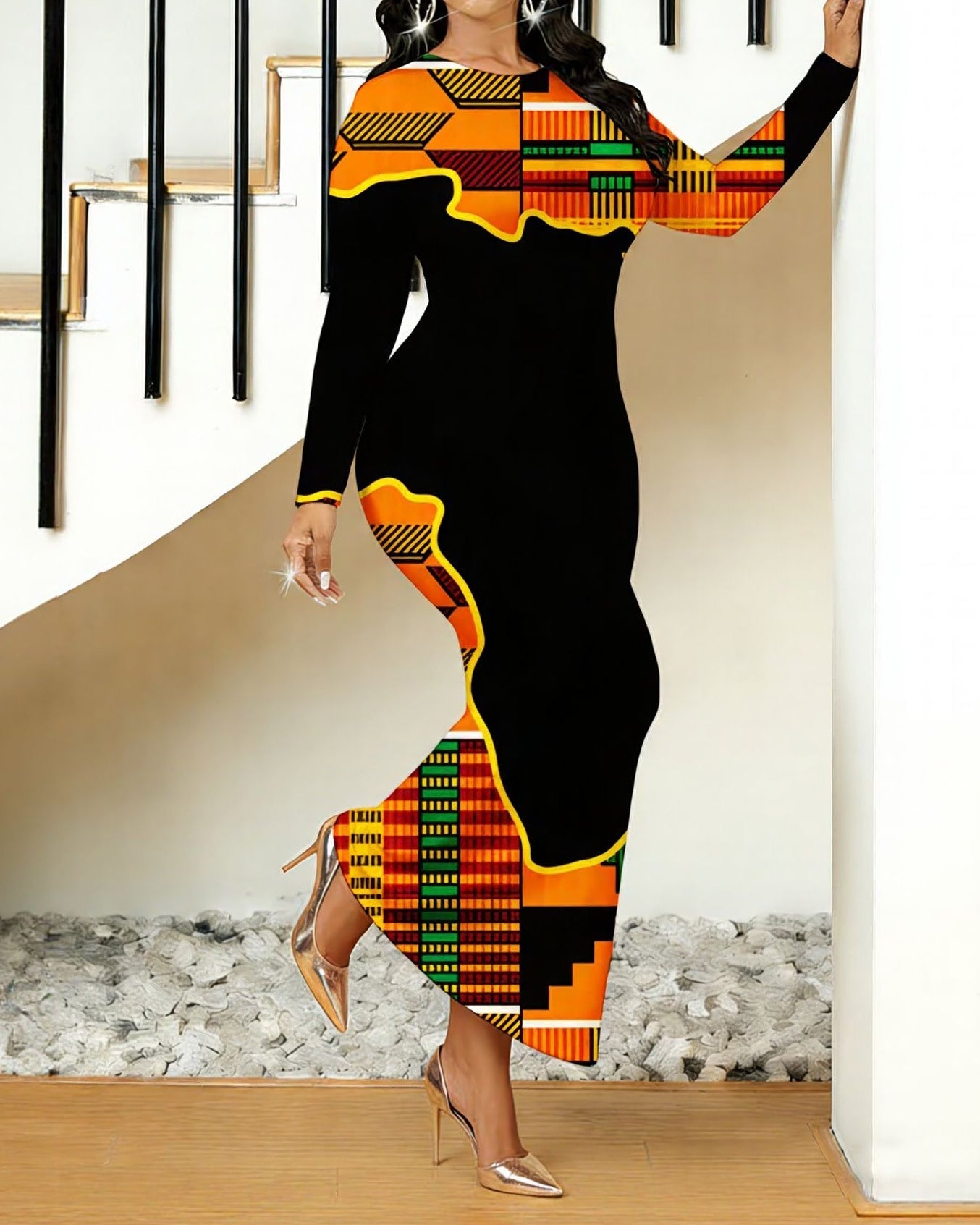 Orange Color African Ethnic Print Round Neck Long Sleeve Bodycon Dress