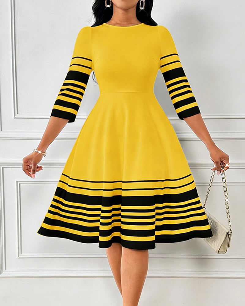 Simple Black Striped Patchwork Print Round Neck Long Sleeves Midi Dress