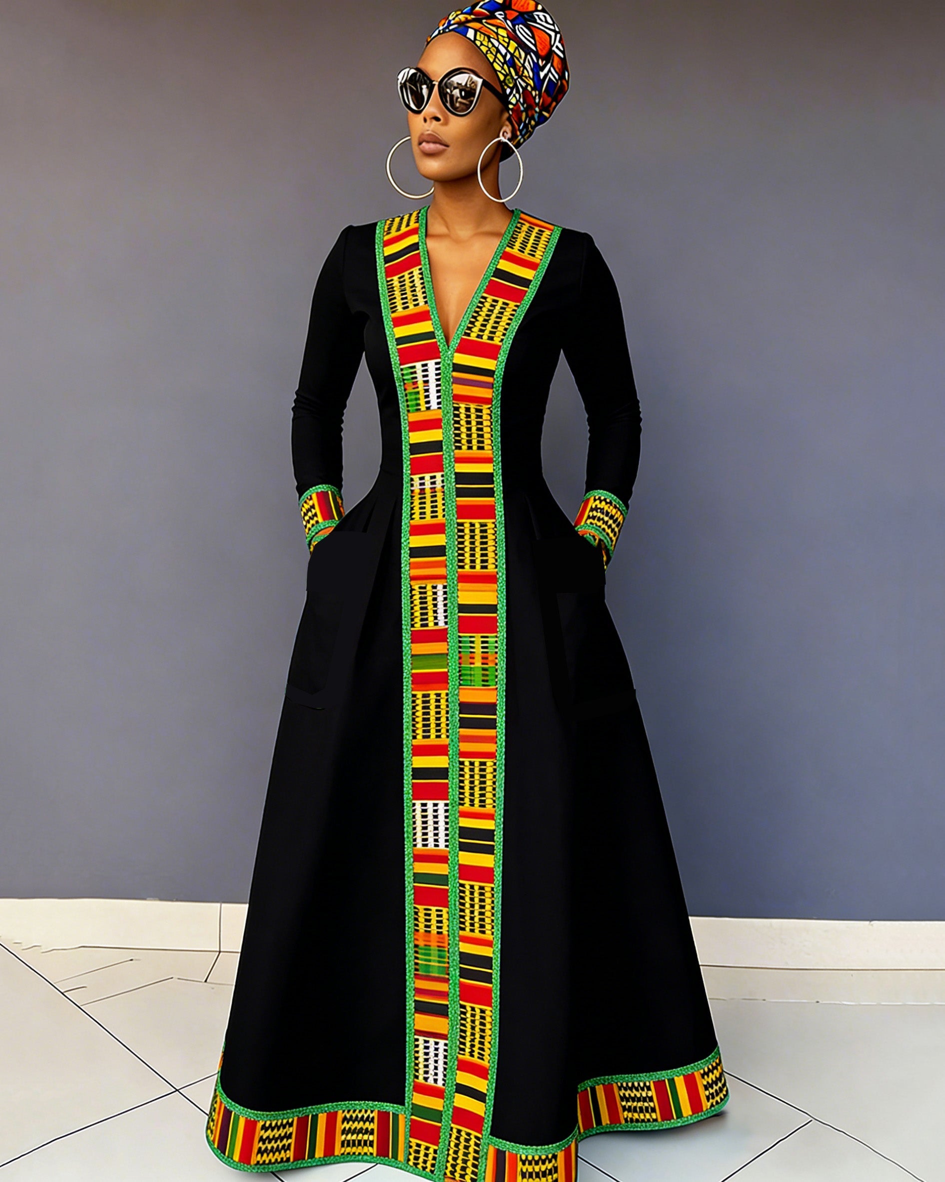 Women V-Neck Reggae Black African Ankara Pocket Long-Sleeved Maxi Dress