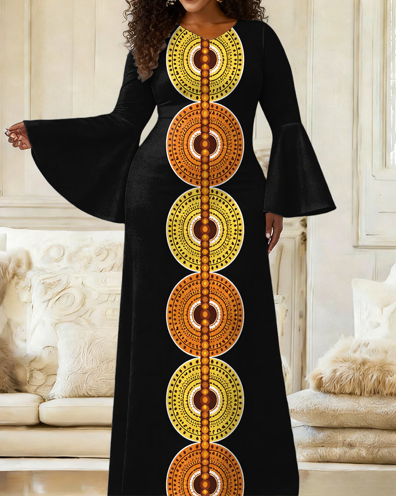 Women's African Polka Dot Color-blocked Print Elegant Bell-Sleeve Slim-Fit Dress
