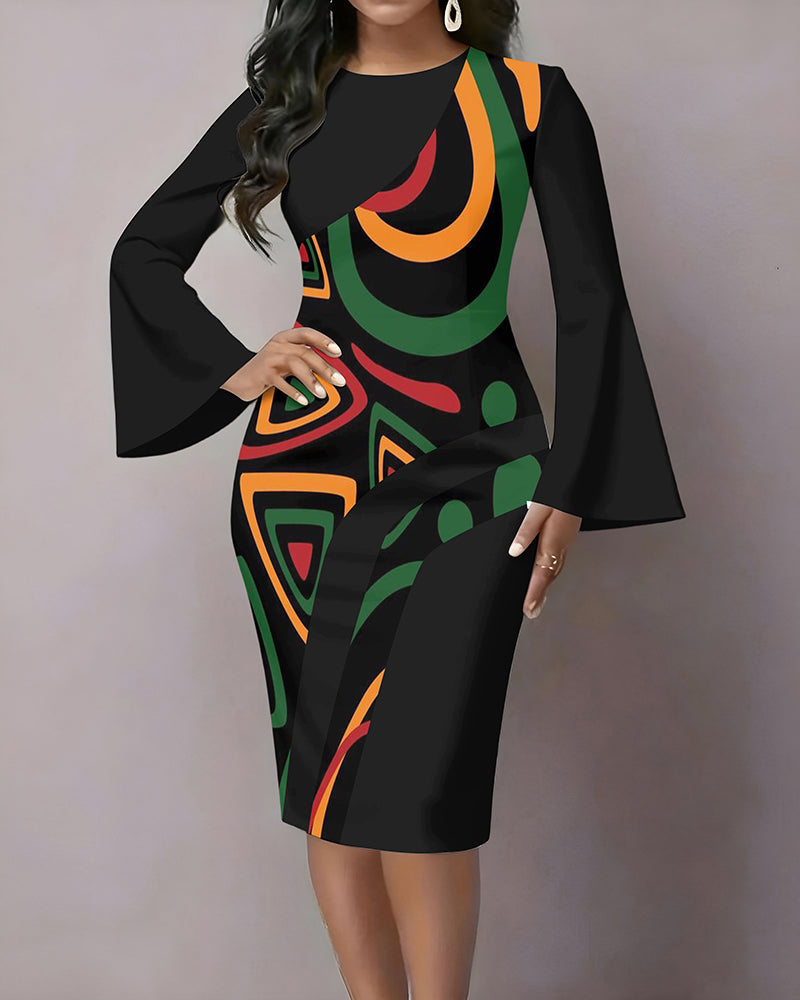 Women'S Elegant Bell-Sleeve Color-Block Ethnic Print Fitted Dress