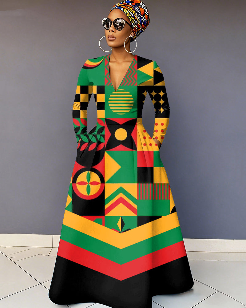 V-Neck Black History Month Stripes Geometric Long-Sleeved Maxi Dress