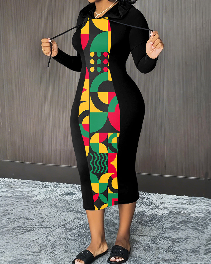 Reggae Geometric Print Patchwork Hooded Long Sleeve Hip Dress