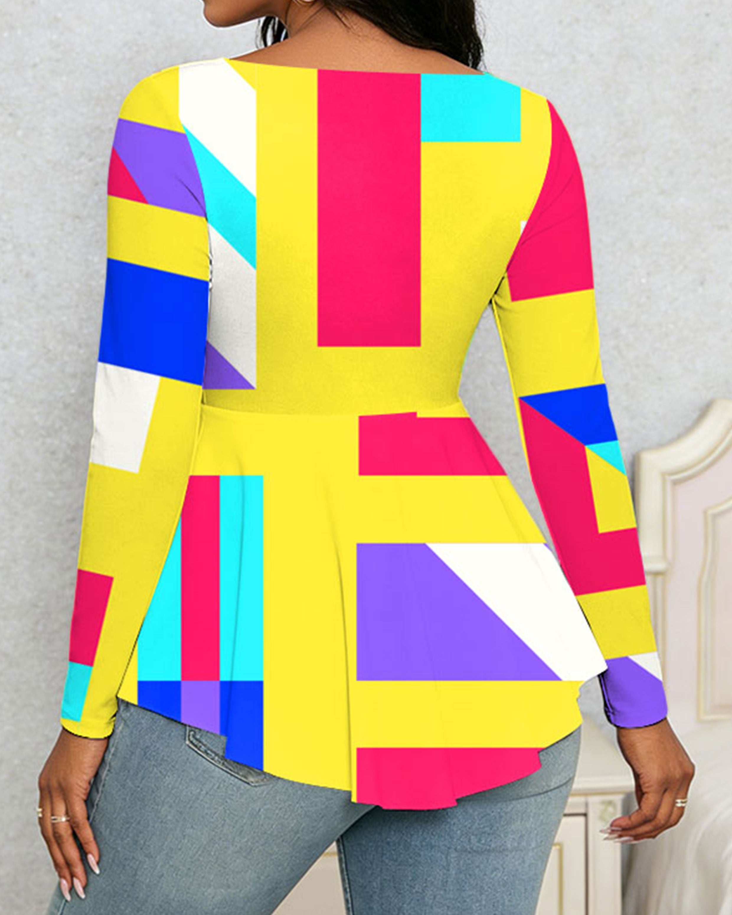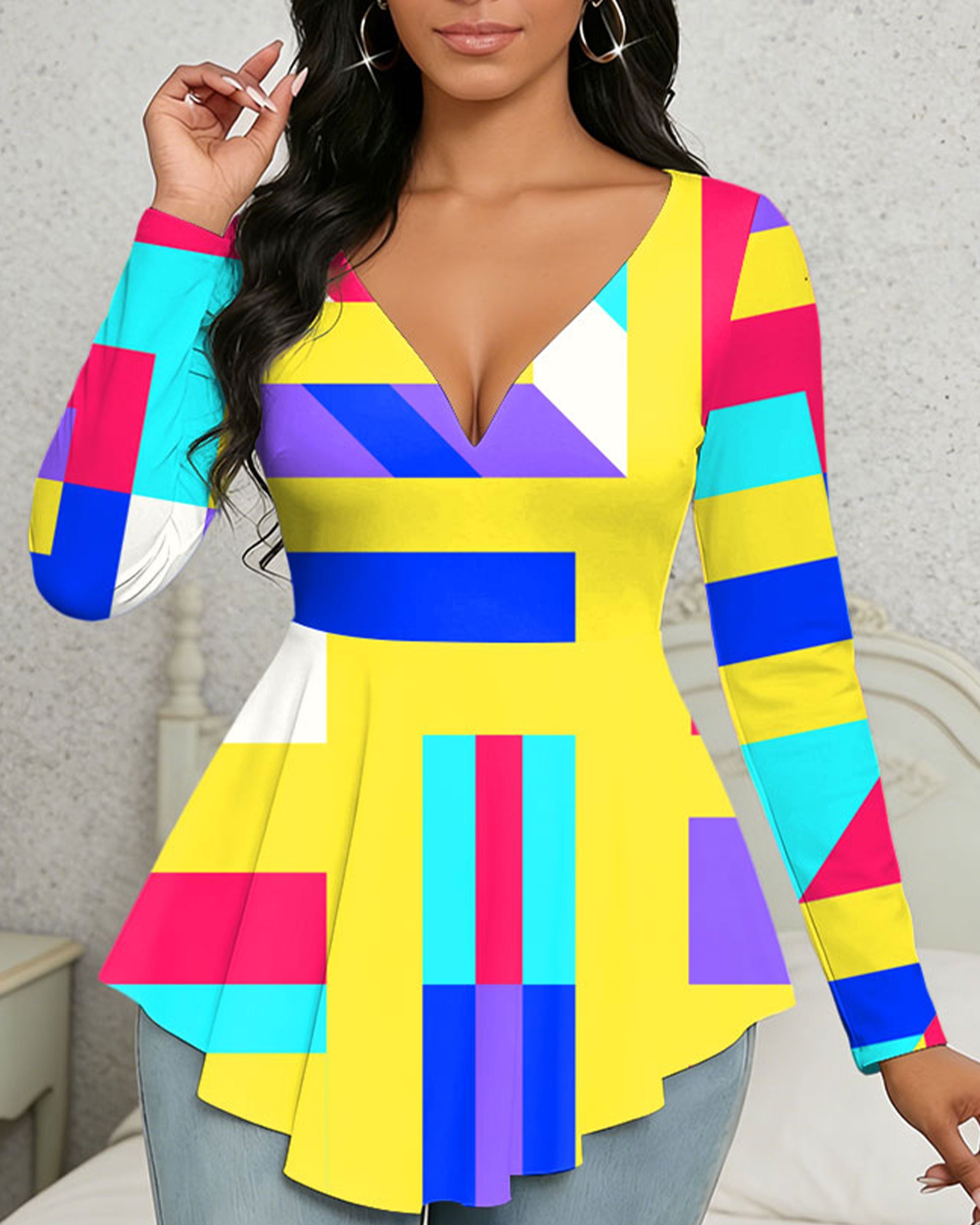 V-Neck Women's African Fabric Traditional Color Matching Large Geometric Stitching Hem Irregular Curved Elastic Ruffled Top