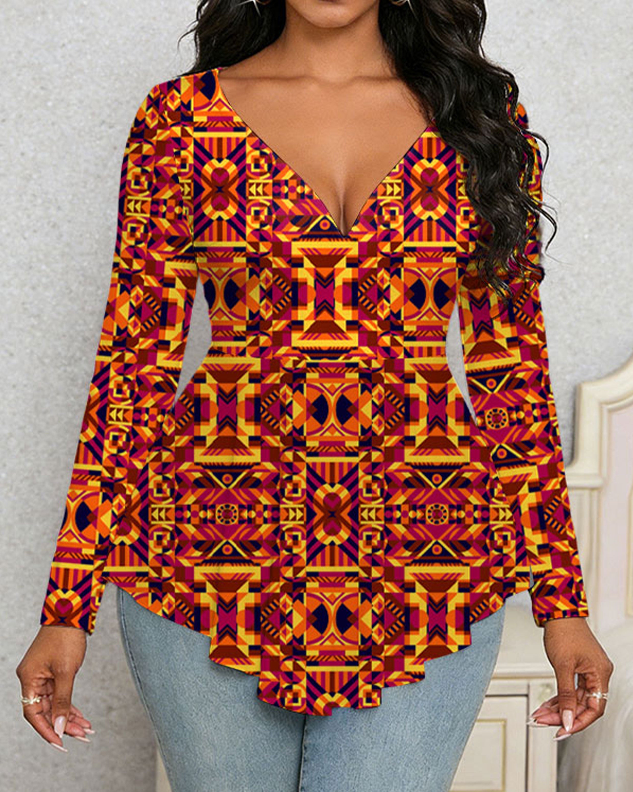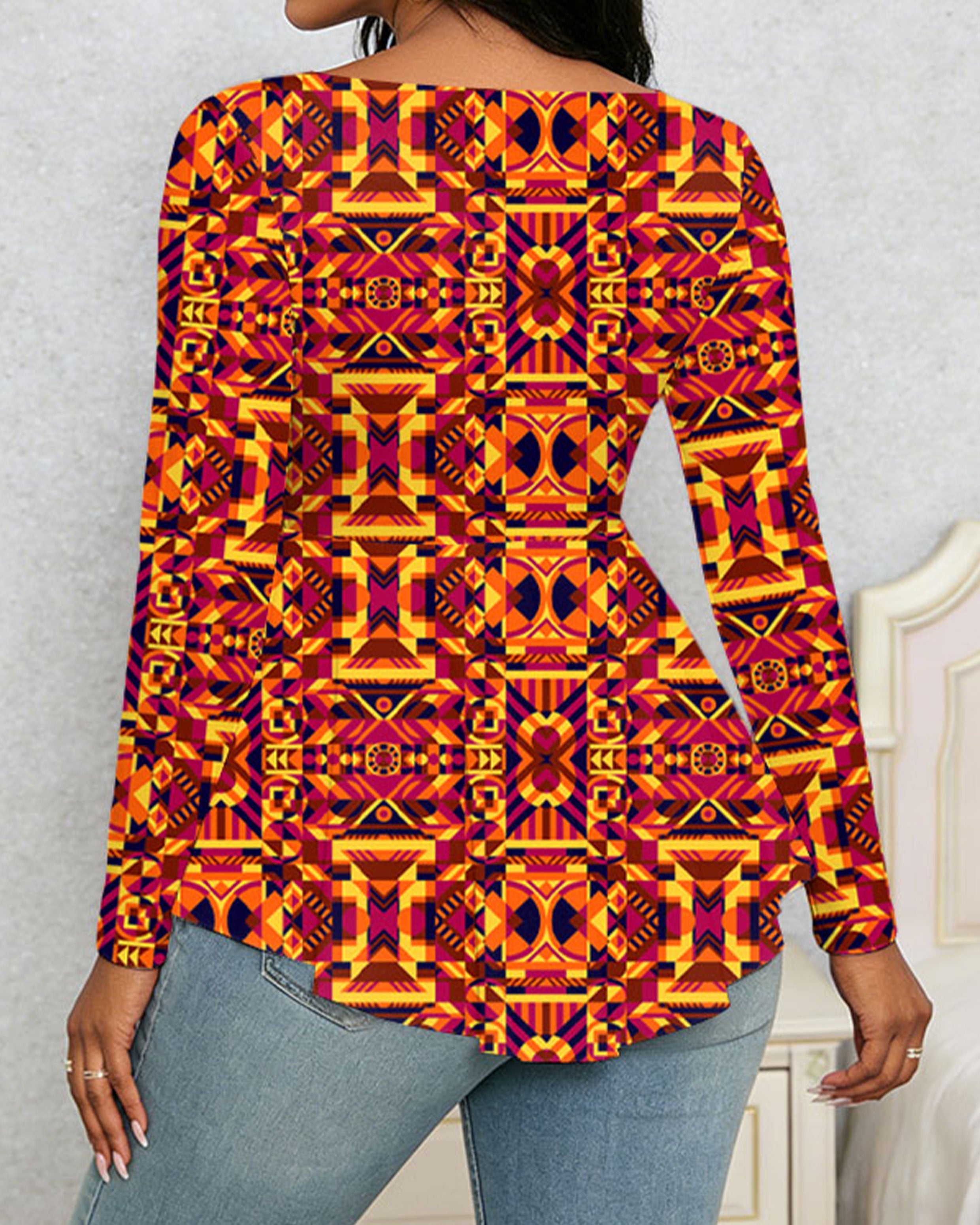 Women's V-Neck African-Style Printed Round Neck Ruffled Top