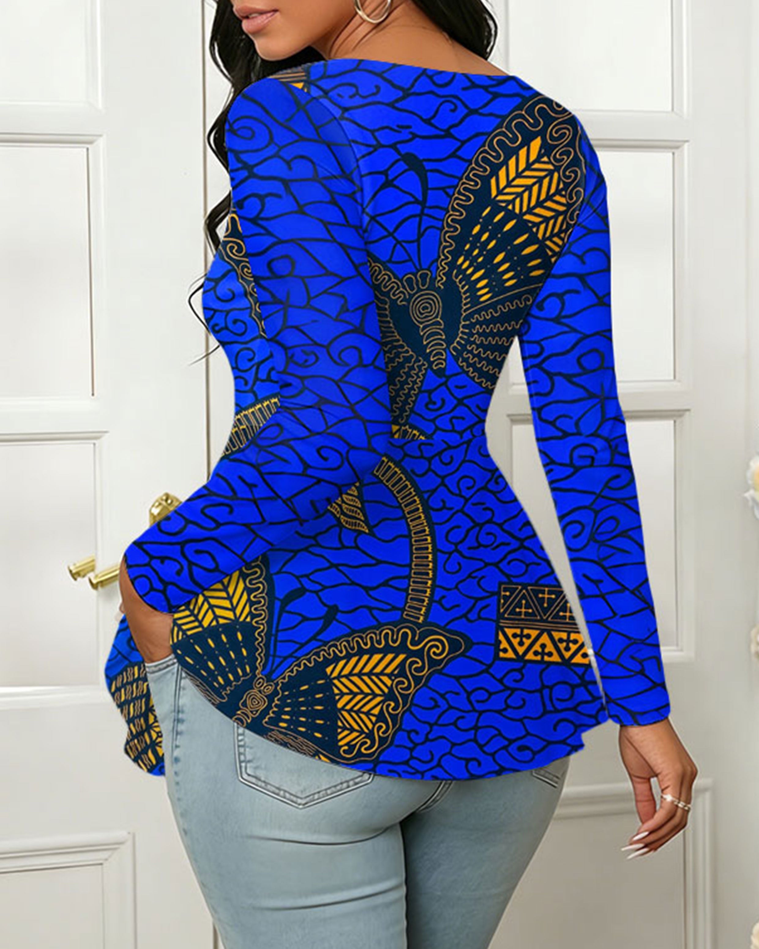 Women's V-Neck African-Style Printed Round Neck Ruffled Top