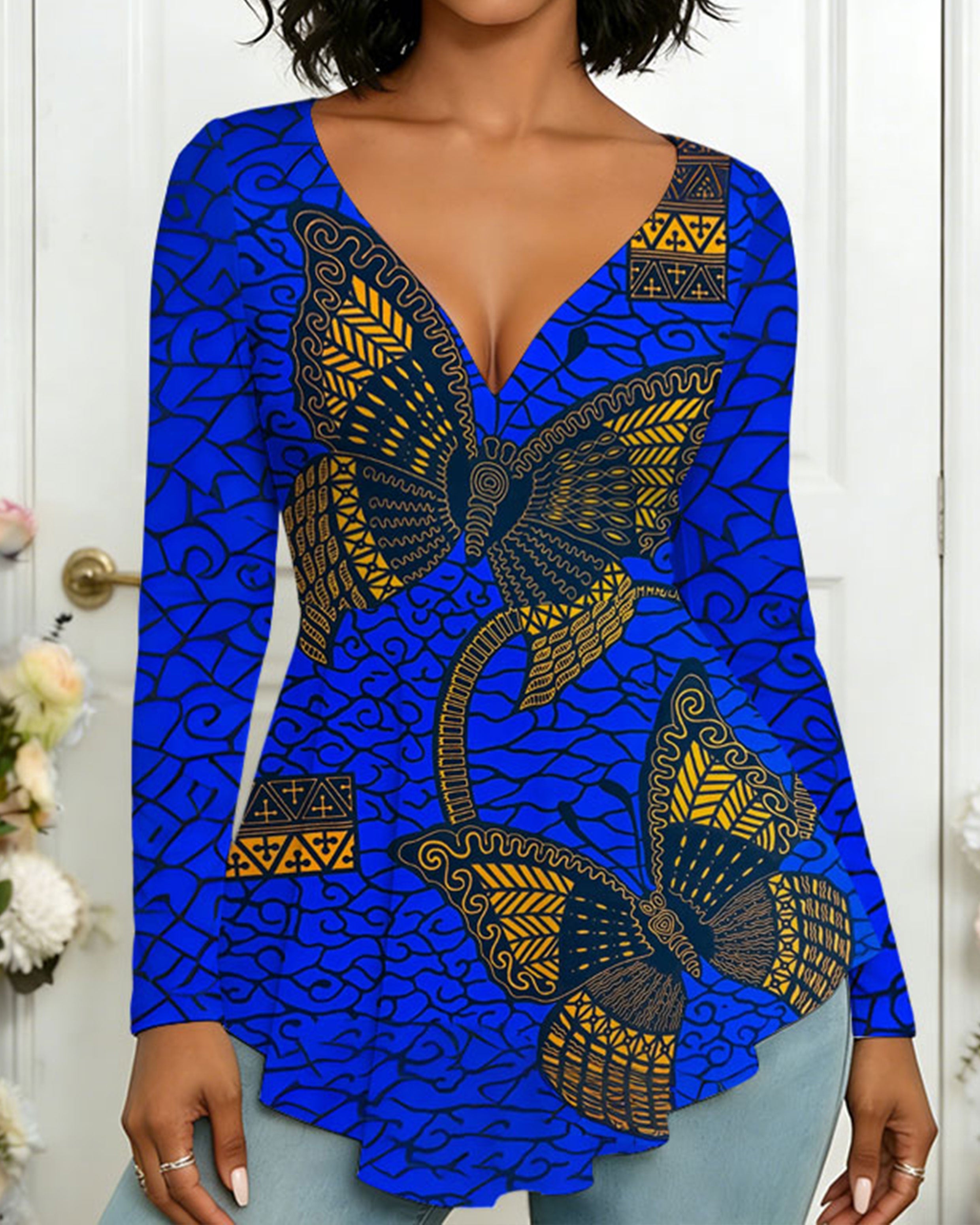 Women's V-neck African Fabric Blue Butterfly Pattern Elastic Round Neck Ruffled Top