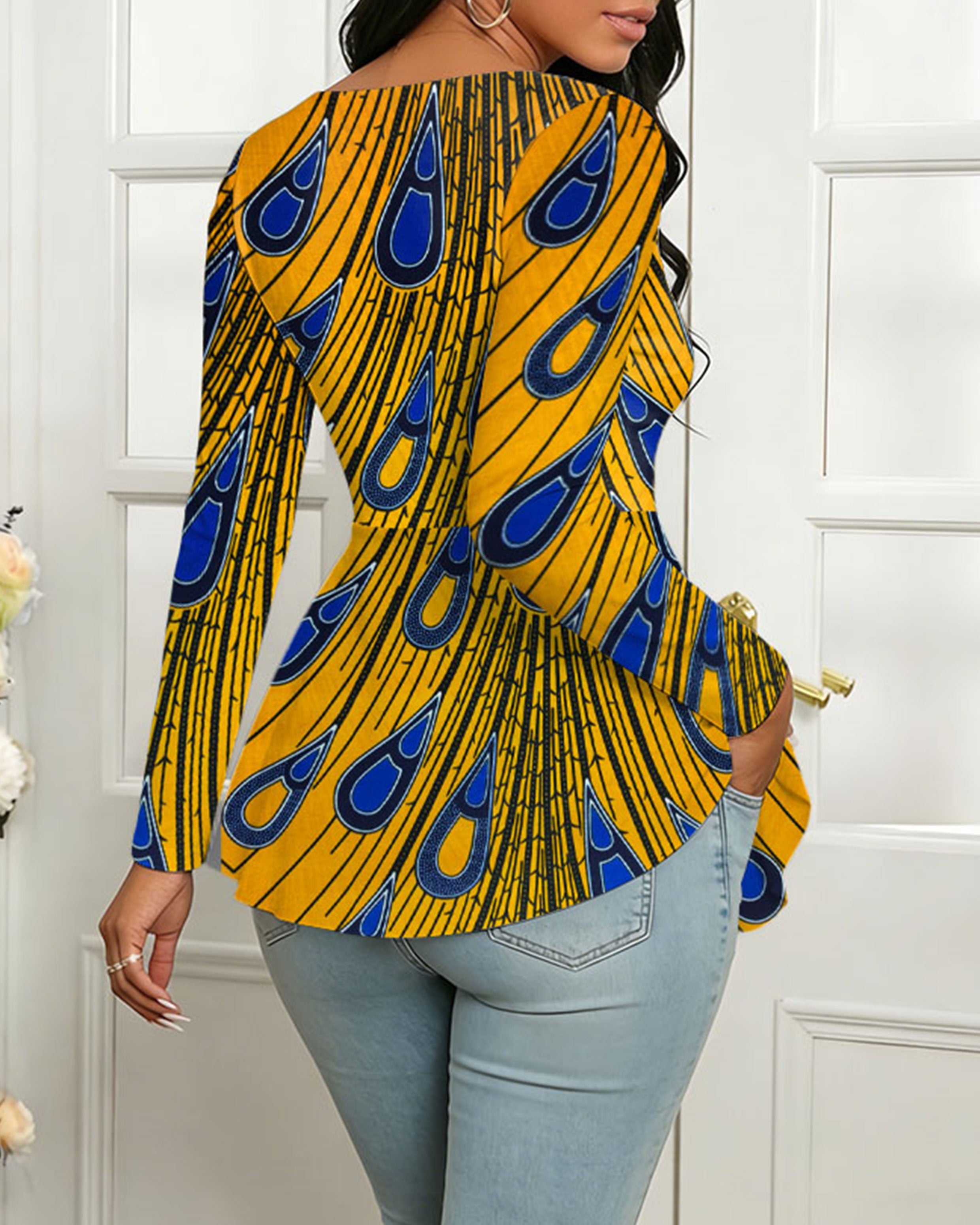 Women's V-neck African Fabric Peacock Feather Pattern Elastic Round Neck Ruffled Top
