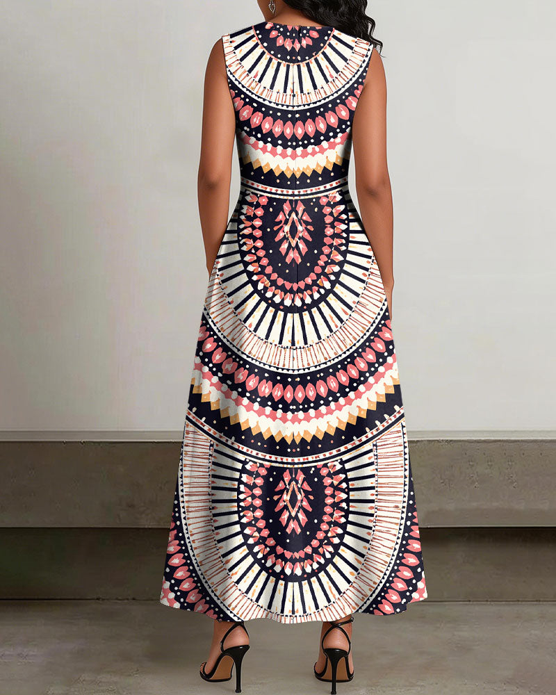 Crew Neck Boho Tribal Print Sleeveless Pockets Maxi Dress