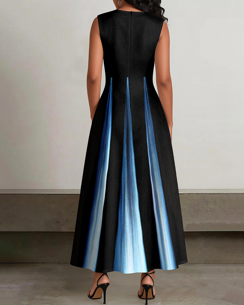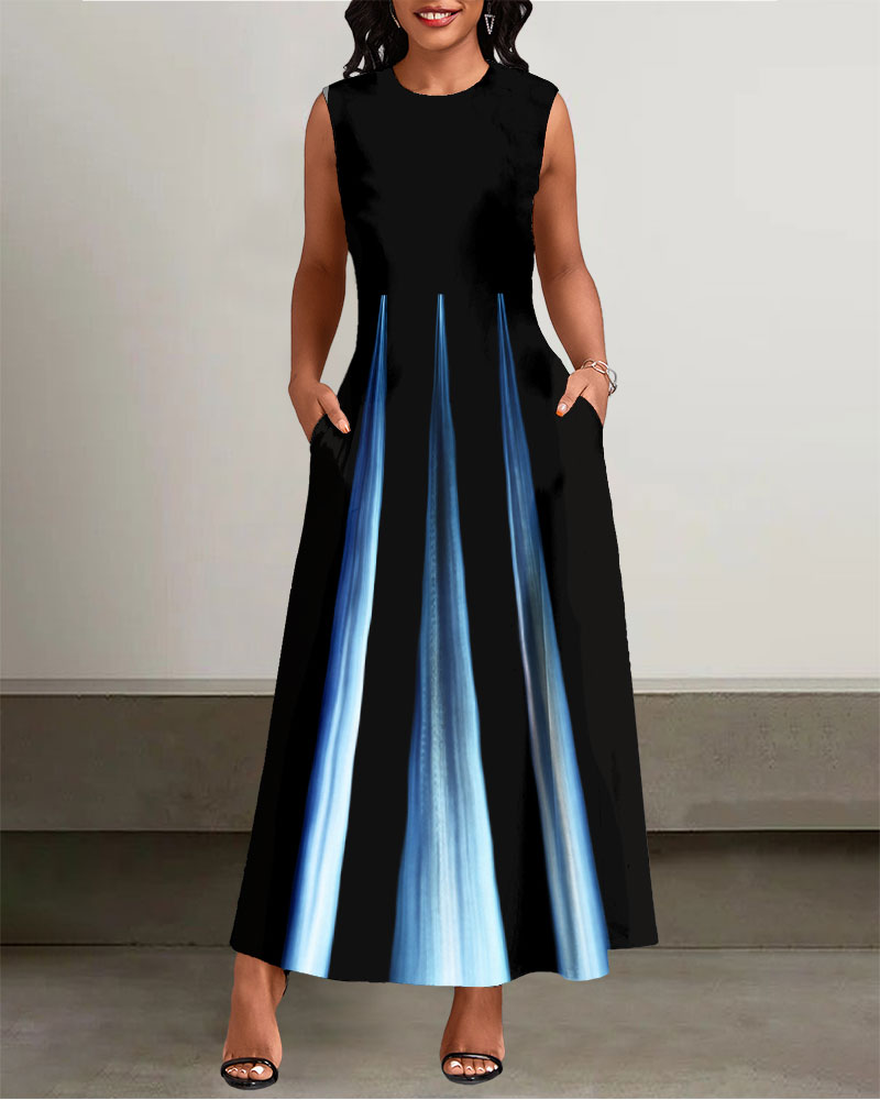 Crew Neck Gradient Stripe Splicing Print Sleeveless Pockets Maxi Dress