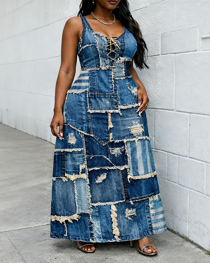 Patch Patchwork Suspender Casual Sleeveless Maxi Dress