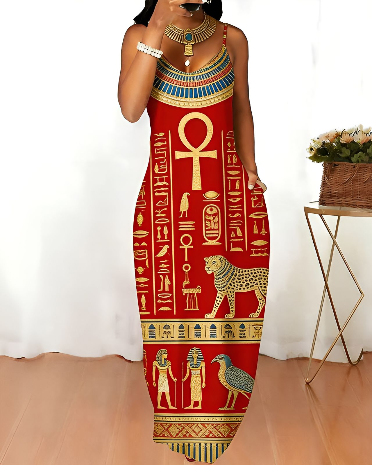 Sling Egyptian Golden Ankh Symbol Print Pocket Maxi Dress