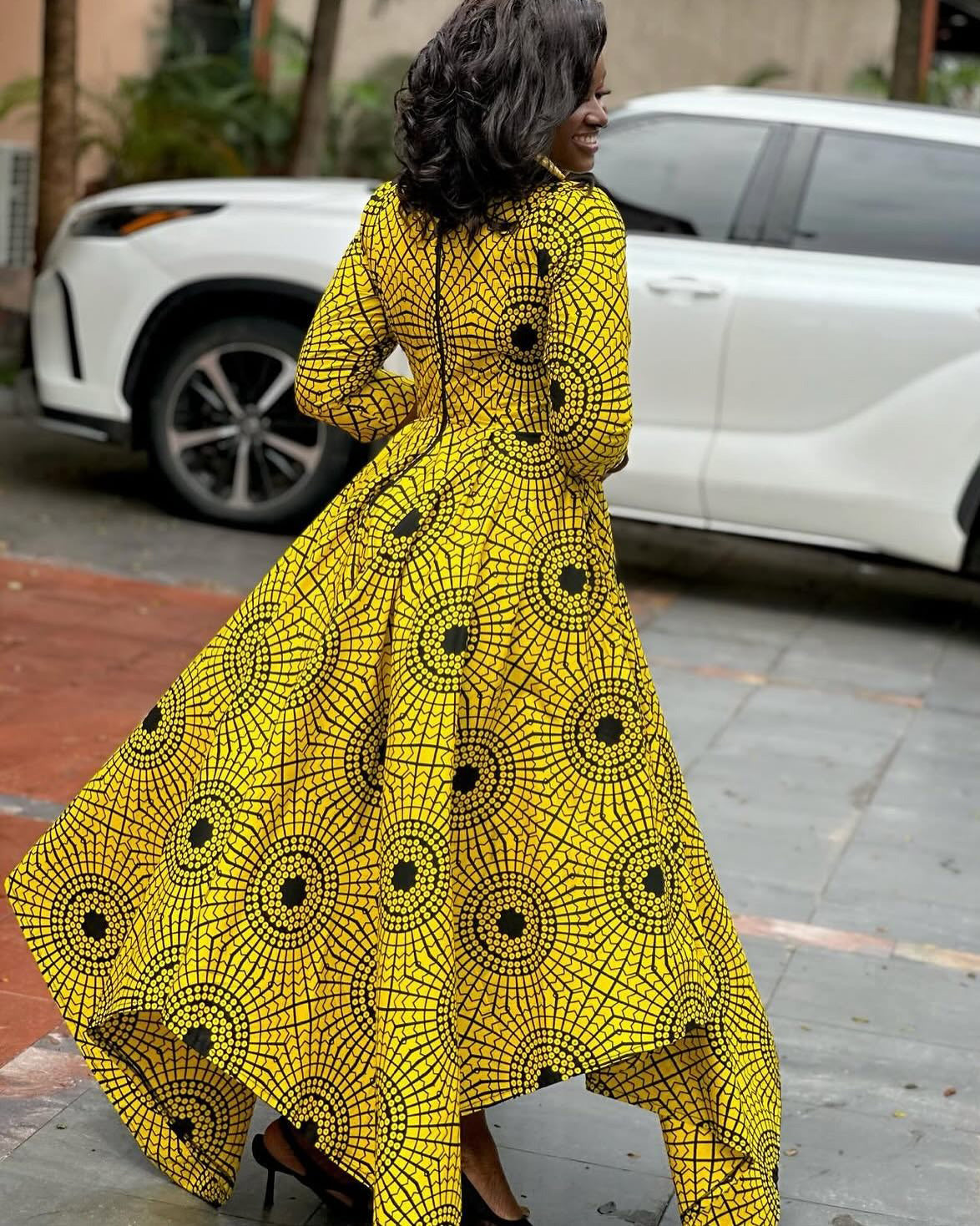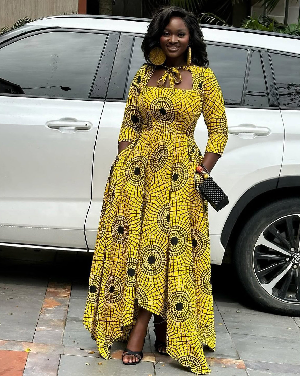 Square Neck Tie-Waist 3/4 Sleeve Ankara Yellow Polka Dots Maxi Dress
