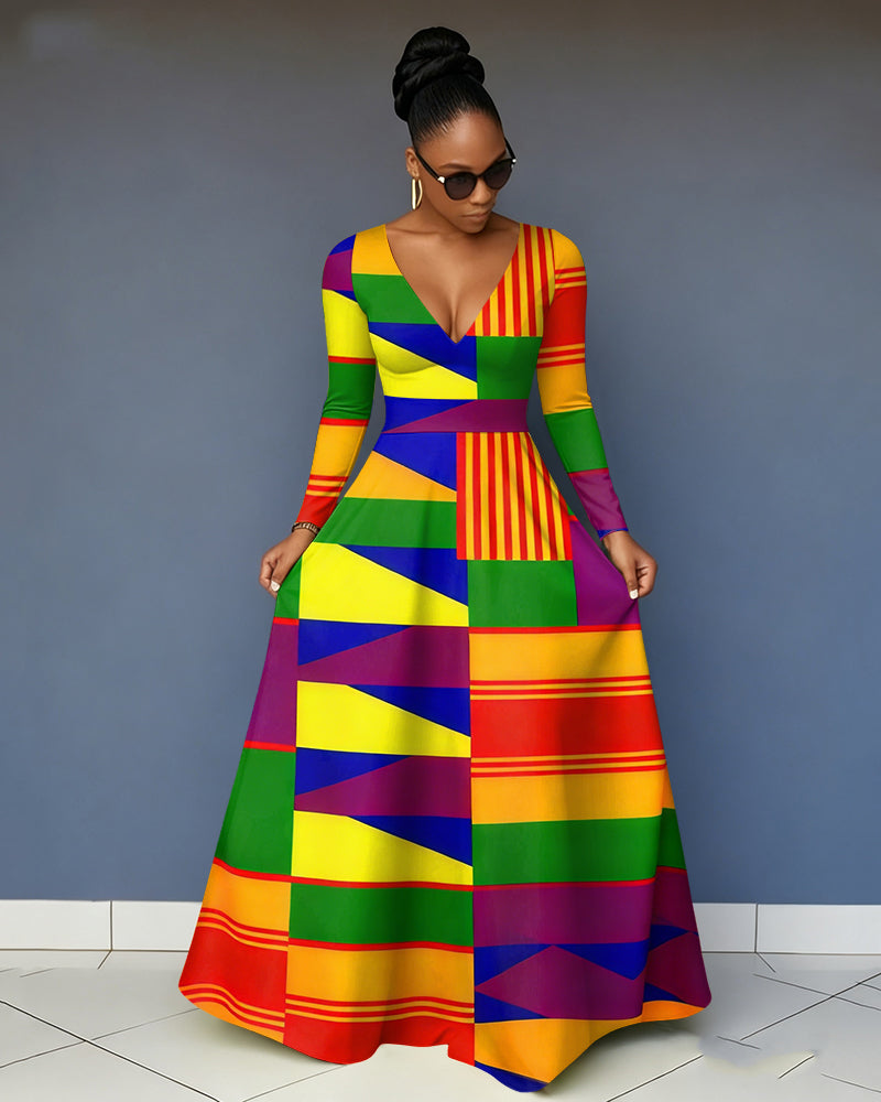 V-Neck Africa Print Black History Month Long-Sleeved Pocket Maxi Dress