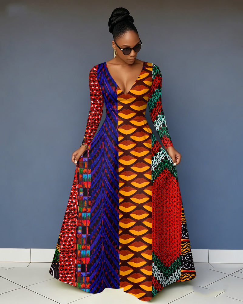 V-Neck African American Culture Pocket Long-Sleeved Maxi Dress