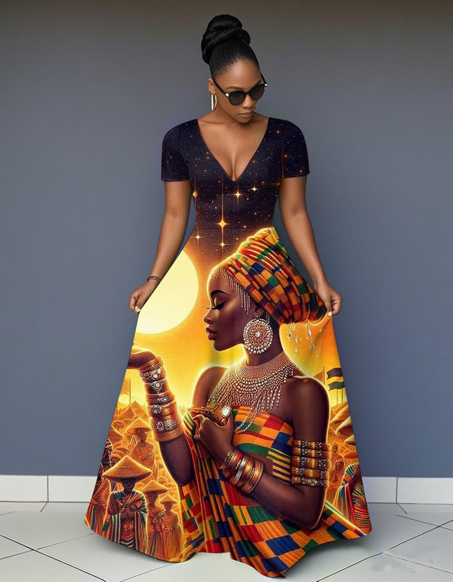 V Neck African Women's Art Short Sleeve Maxi Dress