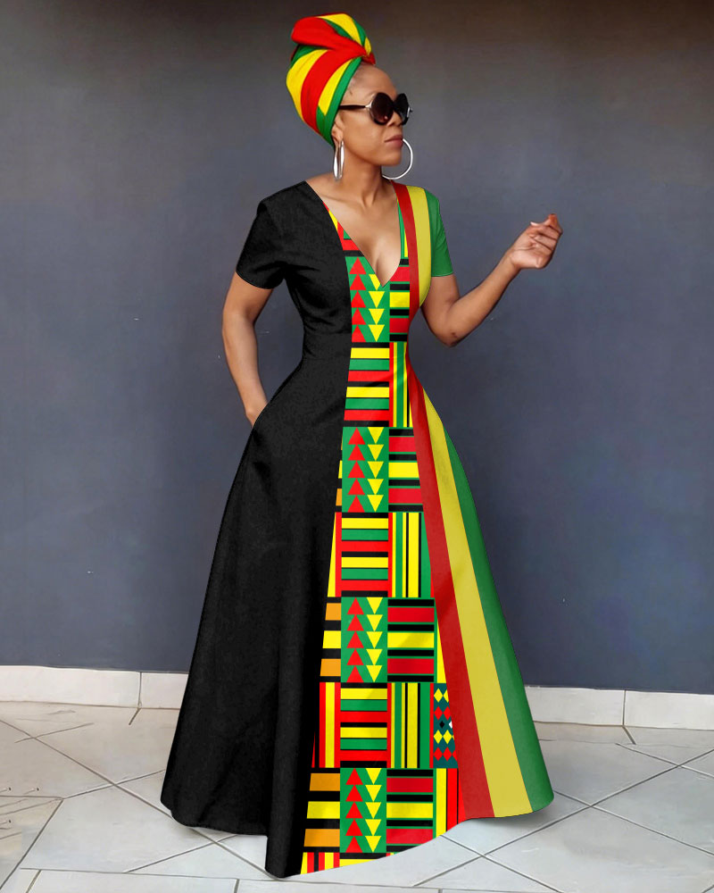 V Neck Black History Month Reggae Print Short Sleeve Pocket Maxi Dress