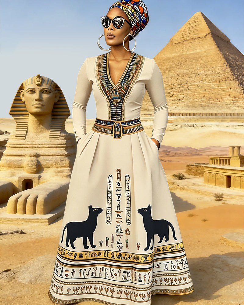 V-neck Egyptian Wolf Totem Pocket Maxi Dress