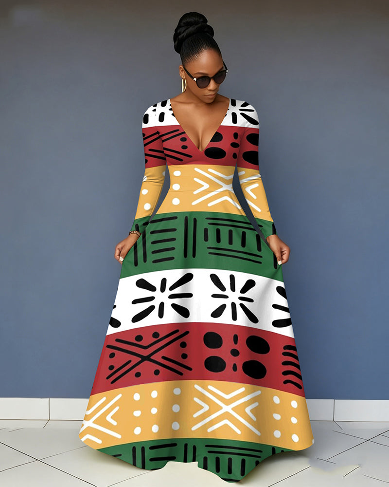 V-Neck Reggae Color-blocked Totem Stripes Pocket Long-Sleeved Maxi Dress