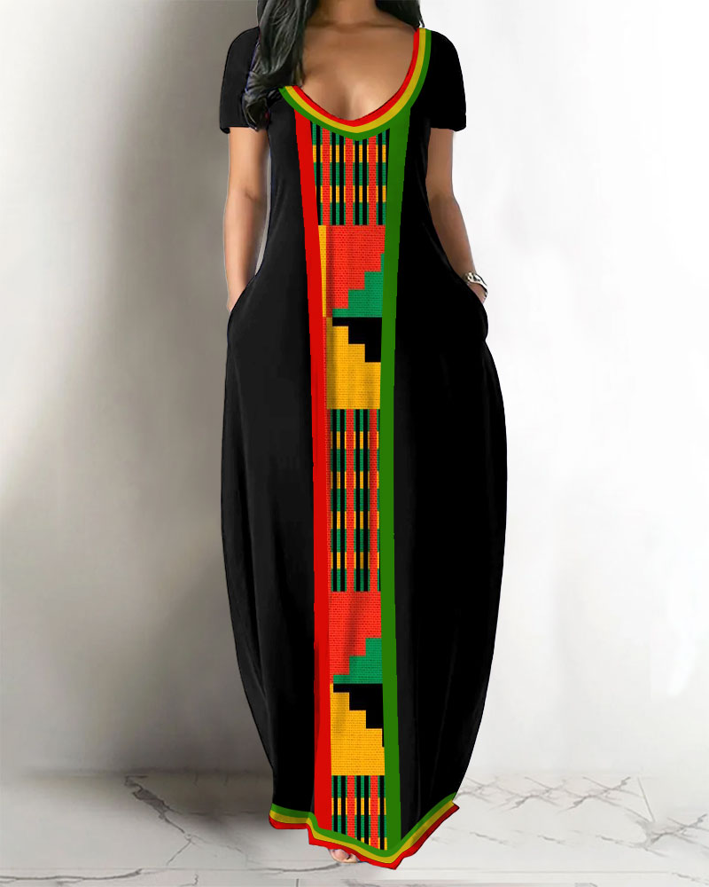 V-neck Reggae Stripe Totem Print Patchwork Pocket Short Sleeved Maxi Dress