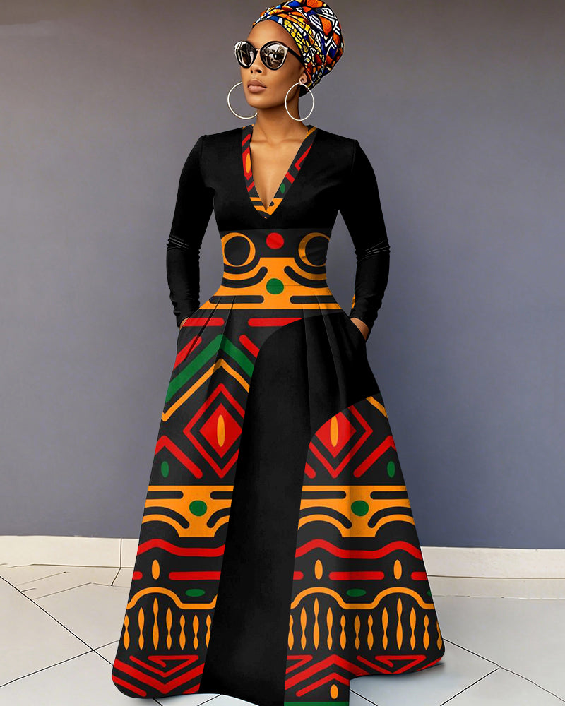 V-Neck Reggae Tribal Totem Pocket Long-Sleeved Maxi Dress
