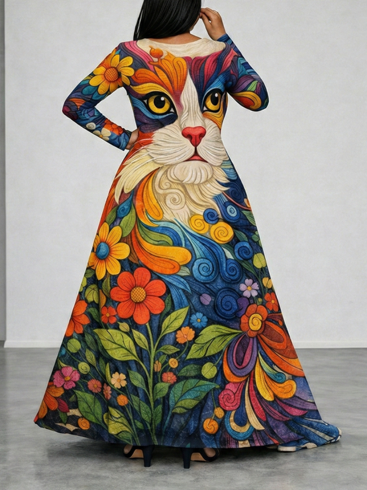 Women Round Neck Colorful Printed Elegant Casual Dress