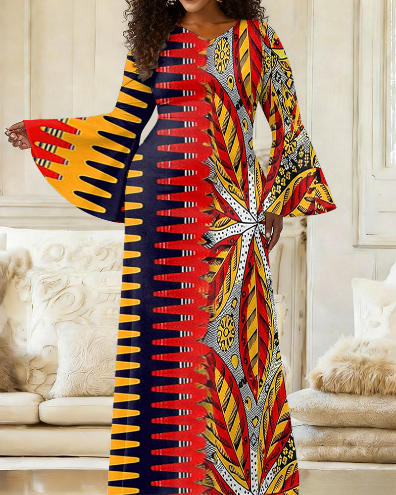 Women Patchwork Print Crewneck Long Sleeve Dress