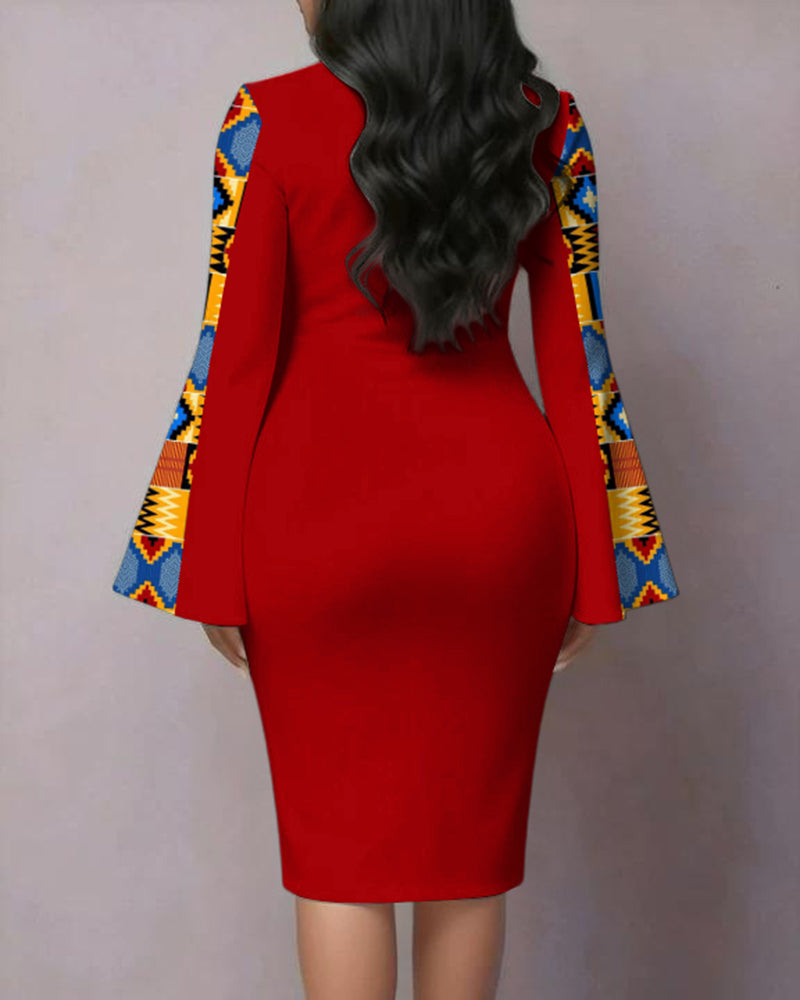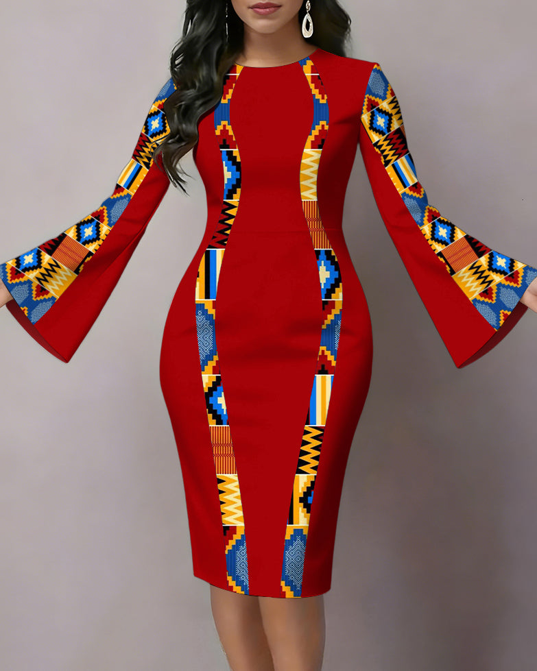 African Totem Print Patchwork Flared Sleeves Midi Dresses