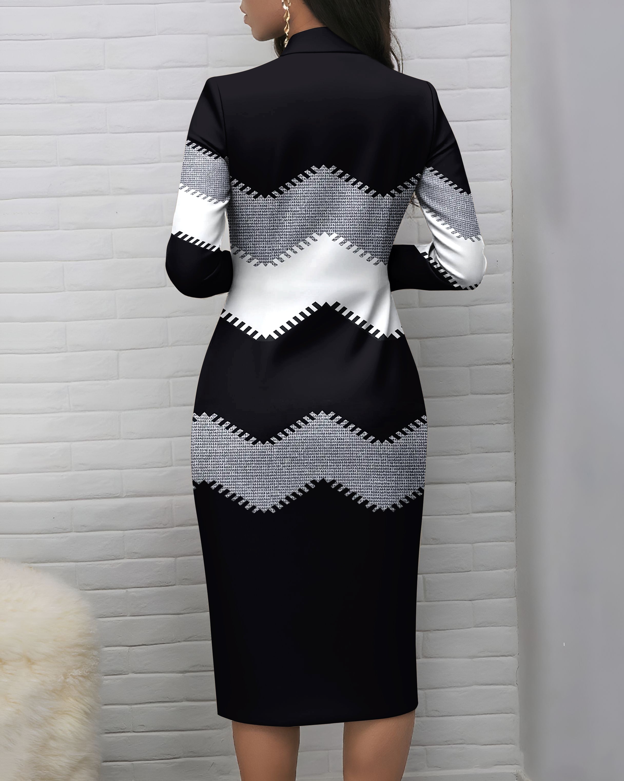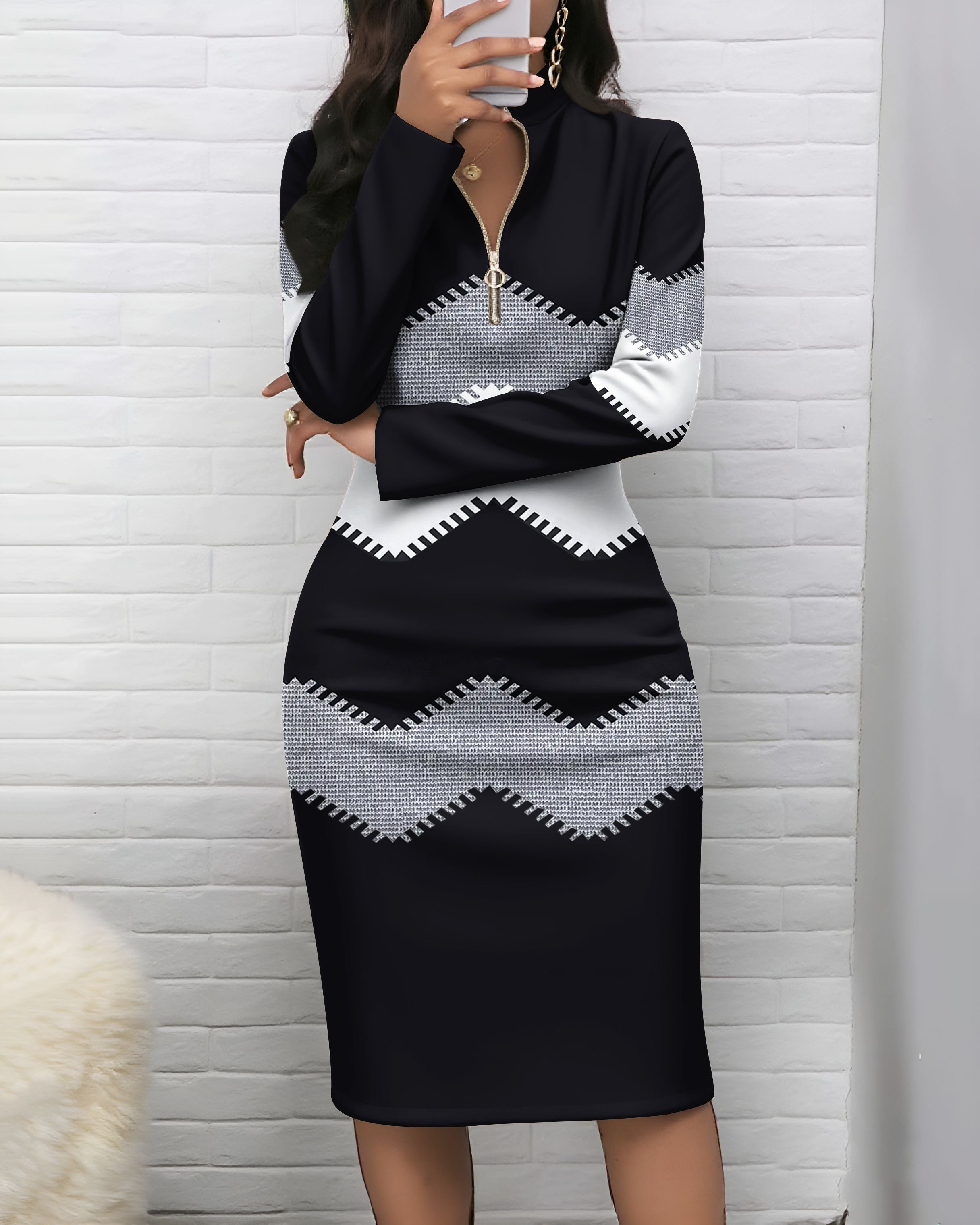 Contrasting Curved Stripes Zipper Stand Collar Long Sleeve Bodycon Dress