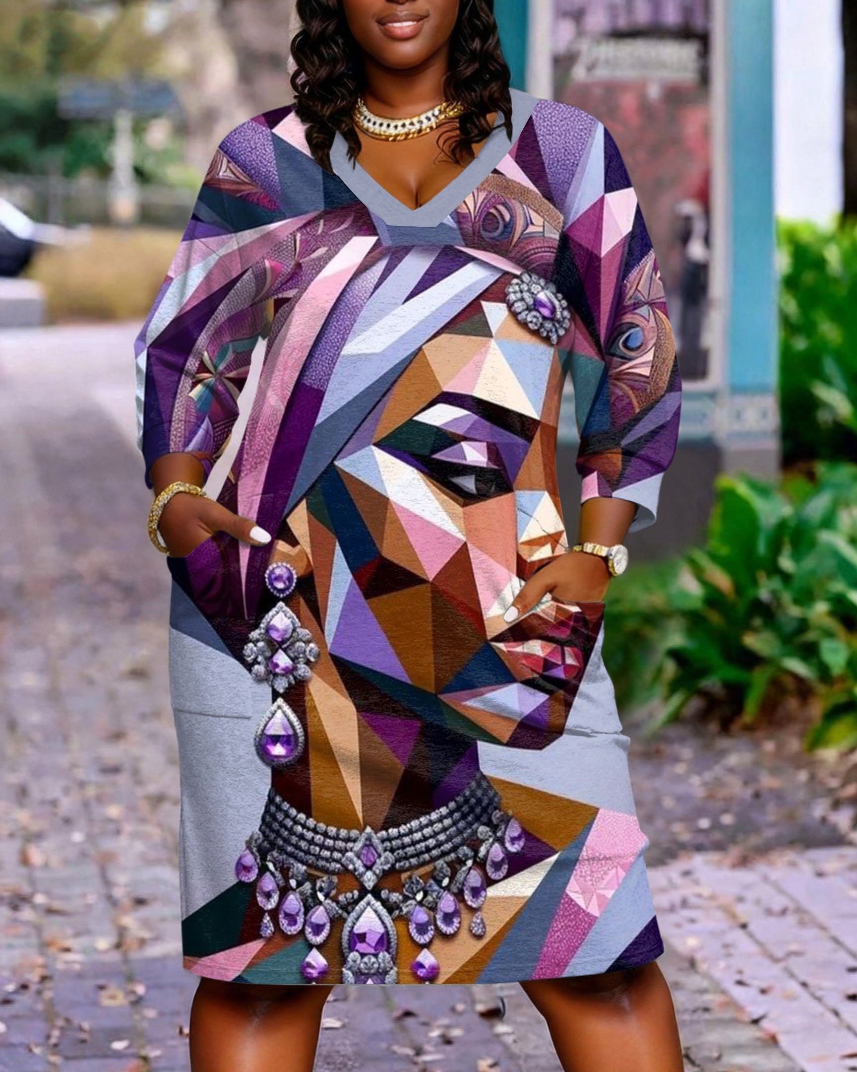 Cubist African Princess Painting Long Sleeve Casual V-neck Pocket Dress