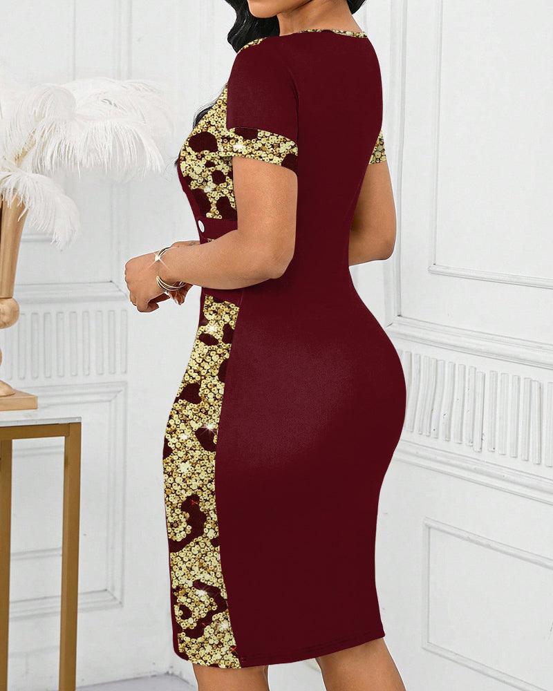Gold Leopard Sequin Print Crew Neck Short Sleeve Bodycon Midi Dress