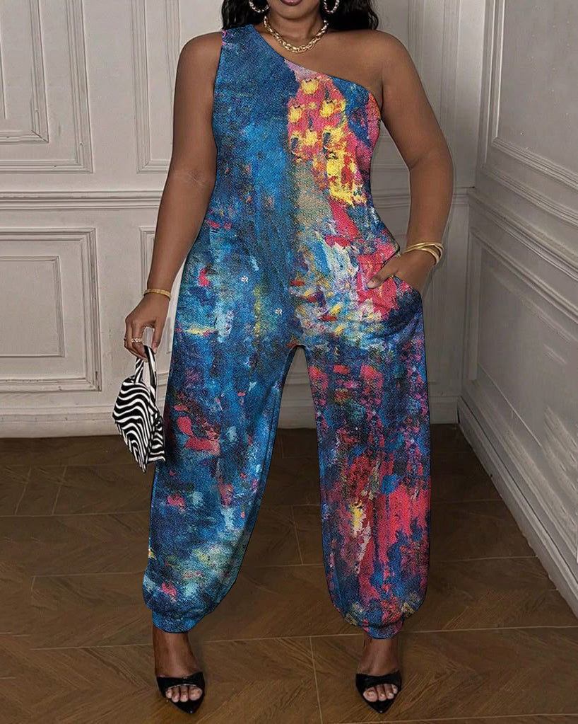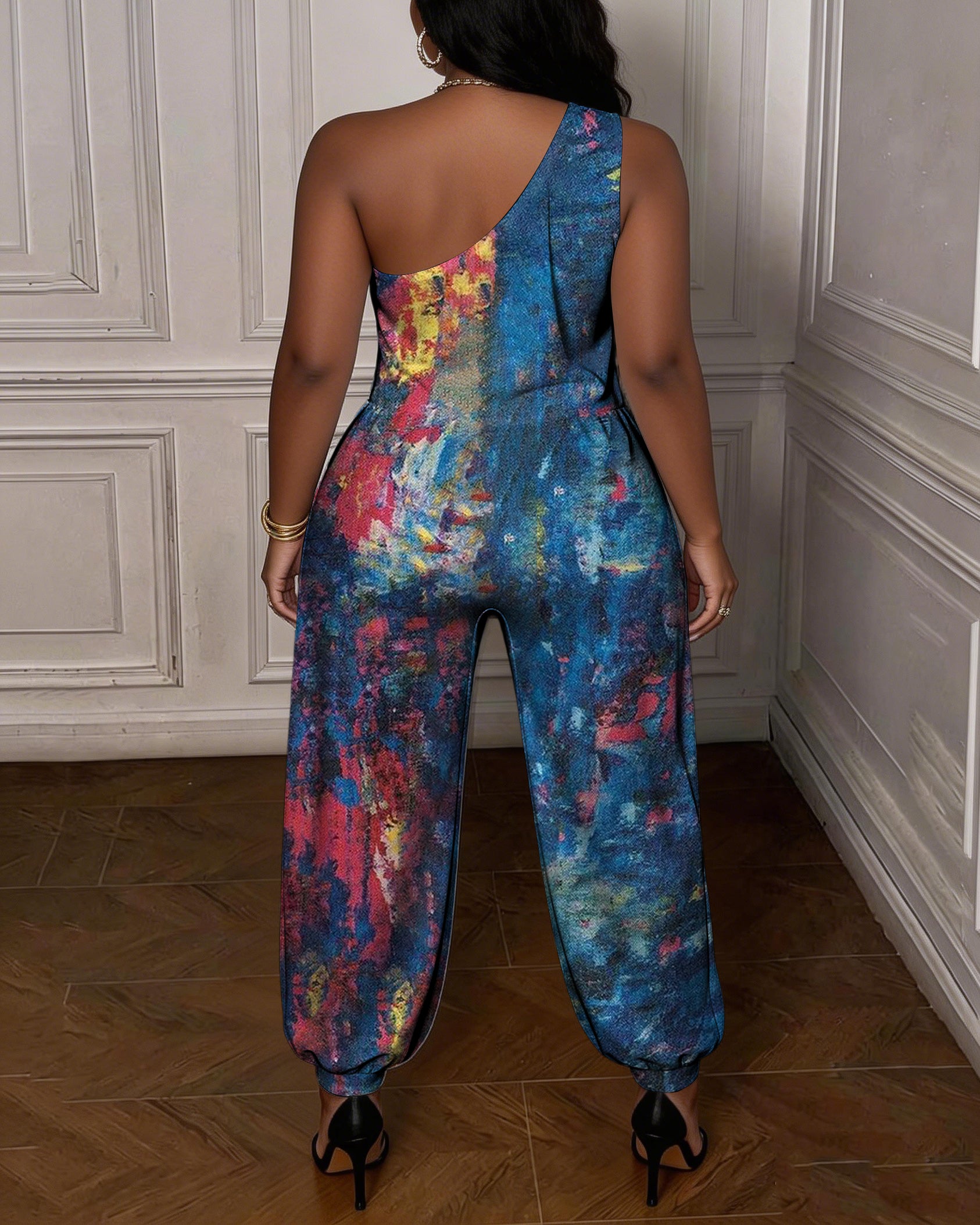 Multicolor Watercolor Splatter Printing One-shoulder Jumpsuit-- Not Faux Denim Fabric