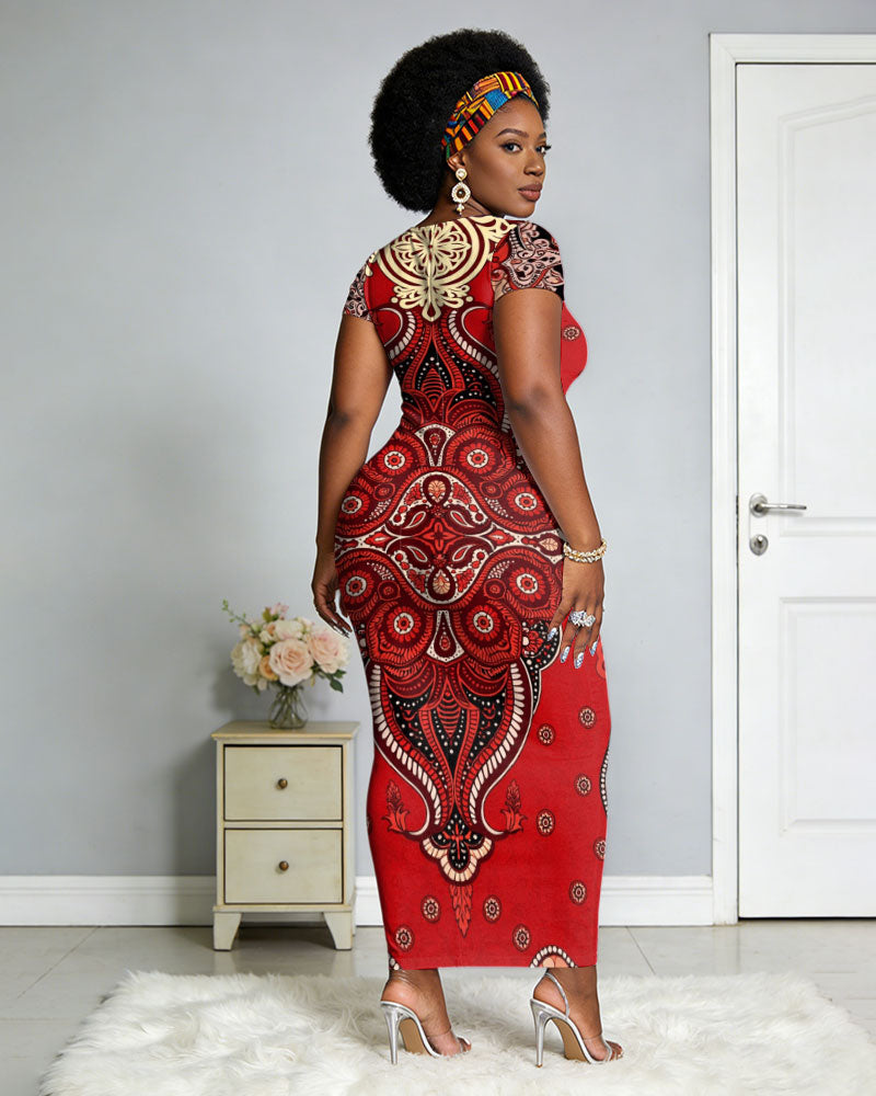 Red Ethnic Pattern Stitching Short Sleeve Dress