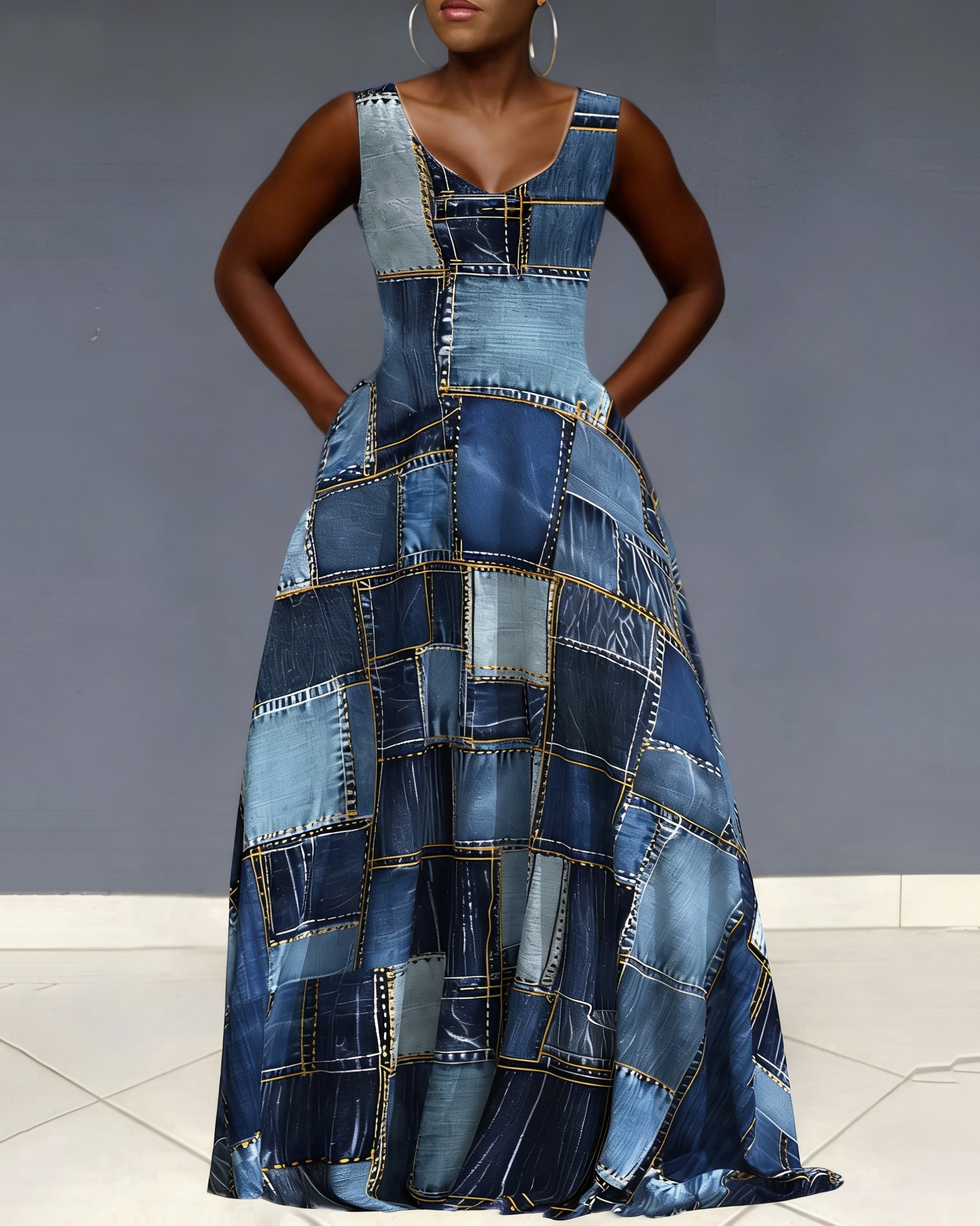 V Neck Denim Allover Pattern Print Sleeveless Pocket Maxi Dress