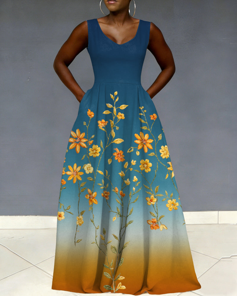 V Neck Gradient Flower Print Sleeveless Pocket Maxi Dress