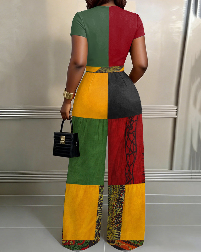Reggae Color Blocking Print High Waist Wide-leg Women's Two-piece Set