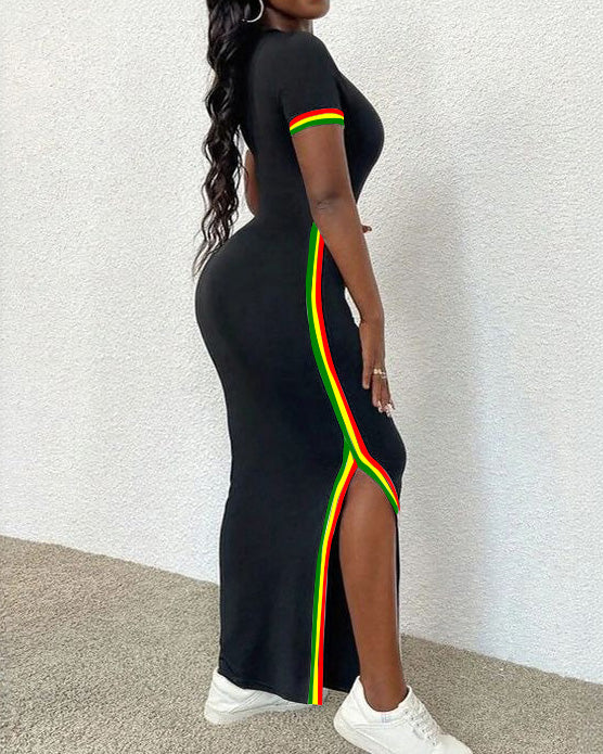 Reggae Stripe Hem Slit Crew Neck Short Sleeve Dress