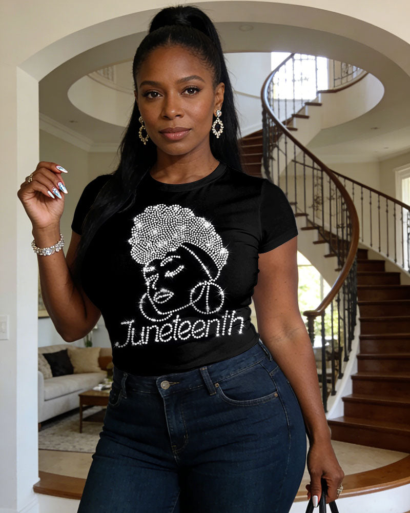 Black History Month Imitation Hot Diamond Goddess Head Pattern Slogan Pattern Printed Short Sleeve T-Shirt